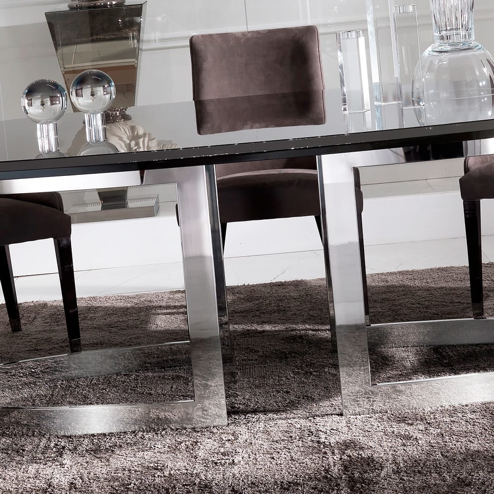 This modern table is shown here with a striking bevelled edge ebony Macassar veneer top on a statement polished stainless steel frame. Available to order in any RAL high gloss or matt finish, silver, gold and champagne leaf. Available in 2 sizes as standard, height 78 cm x width 240 cm x depth 130 cm and height 78 cm x width 280 cm x depth 130 cm. Bespoke sizes available including different leg designs and finishes such as 24 carat gold and antique bronze.