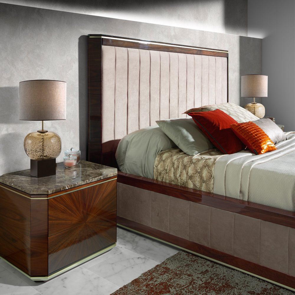 This chic super king size bed, to fit a 180 cm x 200 cm mattress – boasts a high sheen dark rosewood finish, sublimely complemented by a sleek brass trim. Complete with plush cream velvet panel upholstery on the headboard and base. Available in a variety of finishes. Prices will vary.
