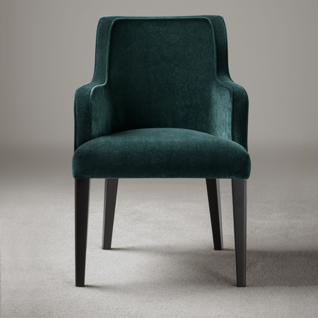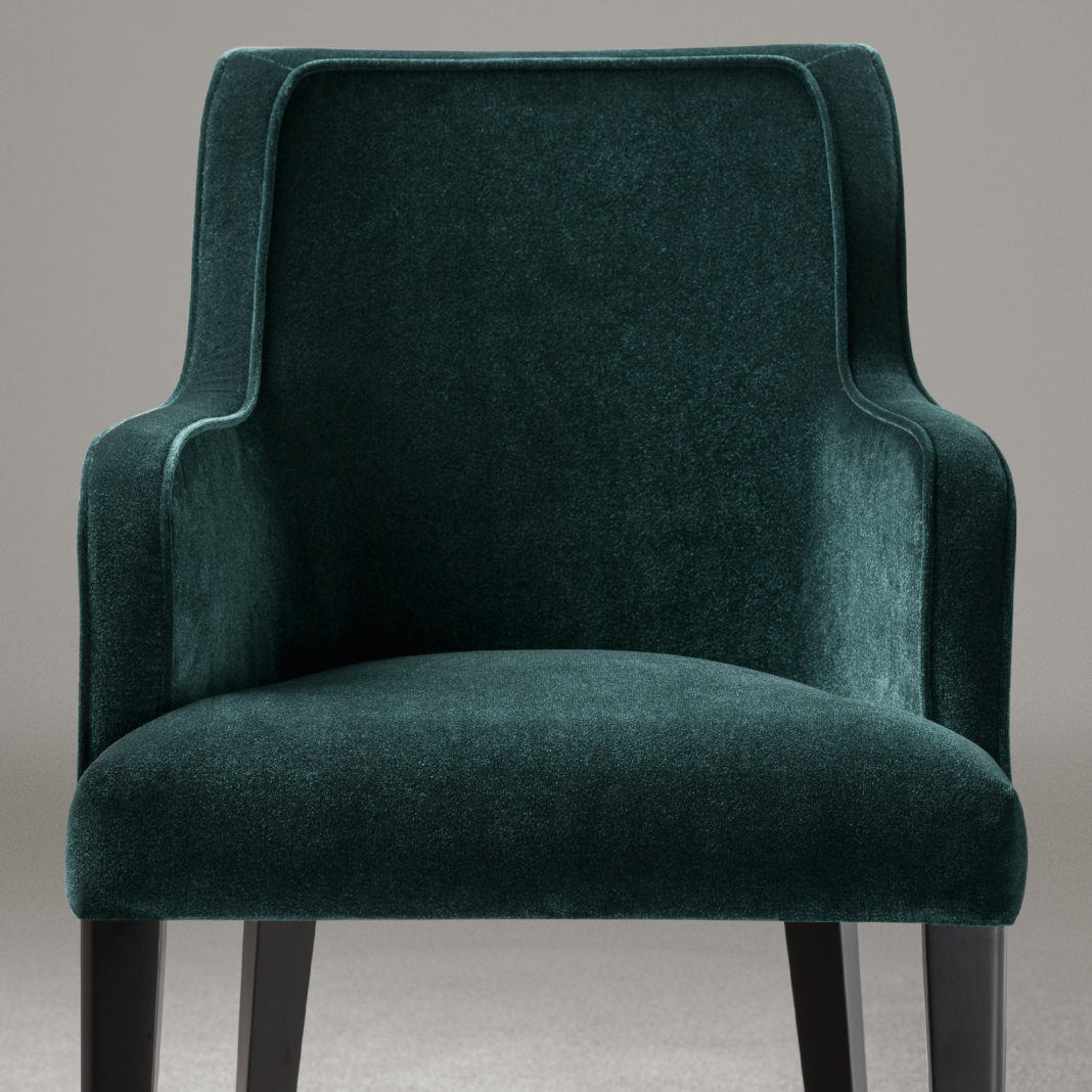 Made of solid beech wood in a mocha finish, padded in three foams for the ultimate in comfort and upholstered to the highest standards in the finest rich teal velvet fabric with defining piping detail. Covers are not removable. Seat height 50 cm and arm height 63 cm. Weight 16 kg. Also available with contrasting piping, in various finishes, leathers and fabrics including customers own by request. Prices will vary.