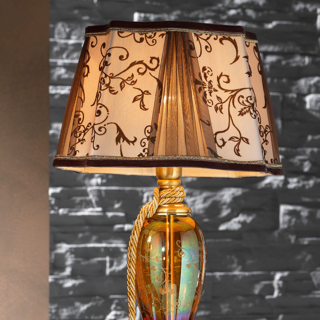 A beautifully ornate brass structure in a Satin Gold finish, supporting a hand blown amber body of glass adorned with Tuscan engravings. Completed by a complementary rope tassel and structured shade in panels of floral patterned fabric and gathered organza, with velvet trim detail. In 2 sizes as standard. Height 72 cm x diameter 40 cm, weight 5 kg – which requires 1 x max 60W E27 Bulb. And height 44 cm x diameter 25 cm, weight 2 kg – which requires 1 x max 40W E14 Bulb. Bulbs are not included. Available with alternative shades, and in various sizes and finishes such as satin silver, and ruby, violet or transparent glass by request. Prices will vary.
