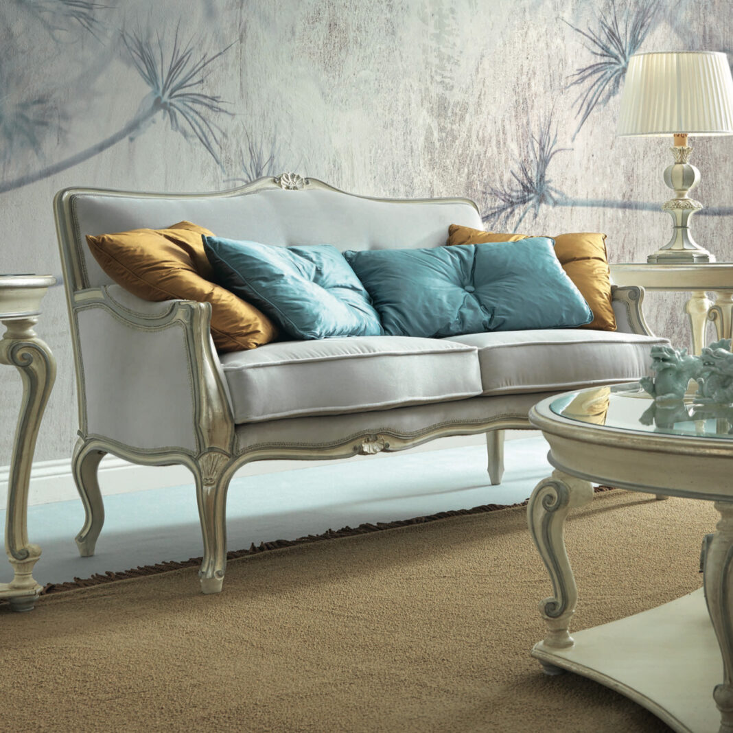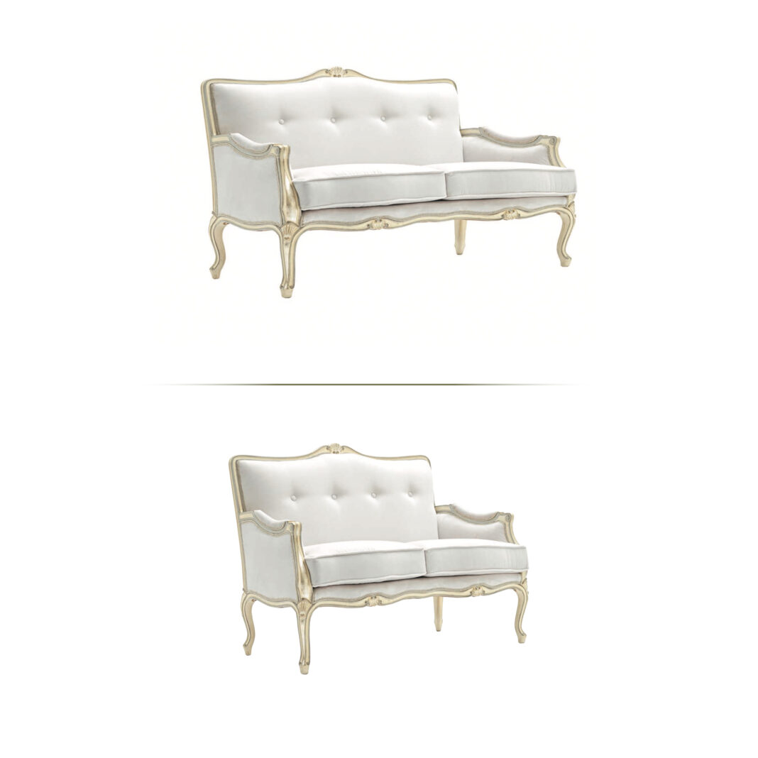 This elegant piece showcases graceful curves and intricate carvings, finished in a striking satined ivory tone with hand-painted silver and grey accents for a timeless, vintage appeal. Button upholstered in luxurious velvet and padded in varying densities, the sofa offers superior comfort with removable seat cushions. Enhanced with feature piping and rich trim detailing. Available in two sizes – three-seater, at height 104 x width 180 x depth 67 cm and two-seater, at height 104 cm x width 160 cm x depth 67 cm. Scatter cushions are not included. Armchair, and custom sizes and finishes are available upon request. With pricing adjustments accordingly.
