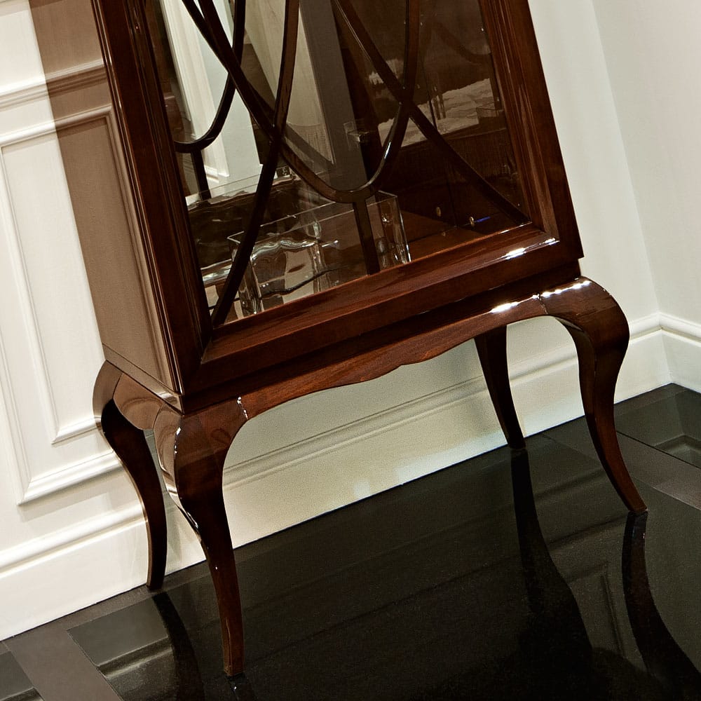 High End Wenge Modern Glamour Display Cabinet. Perfect in pairs as shown, creating a dramatic focus. Made from solid wood and finished in a high gloss with mirrored interior. 1 glass door and 3 interior shelves. Height 220 cm x width 85 cm x depth 51 cm. Available to order in left and right opening orientation, in various colours, finishes and alternative sizes, with or without the motif detail. Prices will vary.