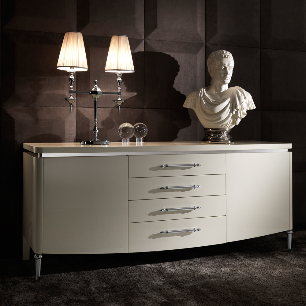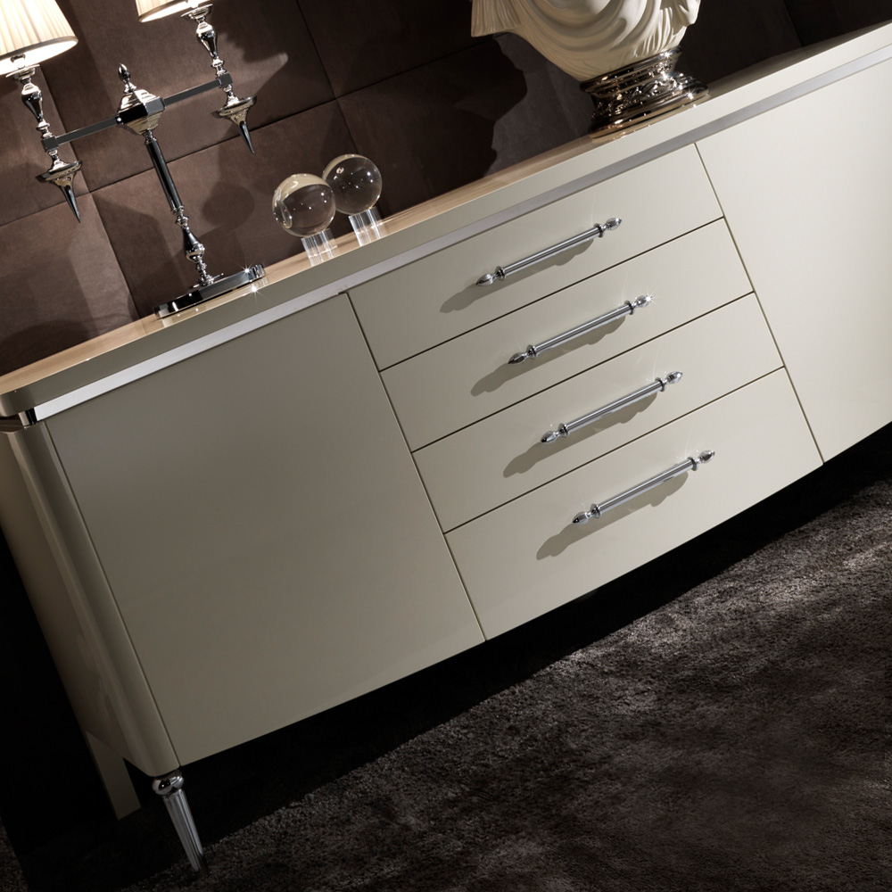 Shown here with a luxurious ivory RAL lacquered finish with bright chrome handles, legs and design trim. Alternative leg designs available including polished 24 carat gold plated. Height 90 cm x width 210 cm x depth 58 cm. The drawers are fitted with an integrated soft close bluemotion system for effortless closing and bespoke internal configurations are available by request. Available to order in any matt or high gloss RAL lacquer colour or high gloss walnut veneer. Prices vary.