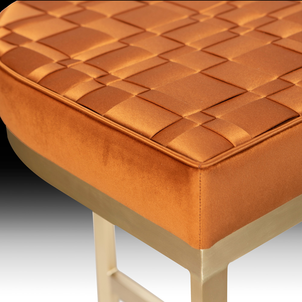 Hand-crafted with remarkable attention to detail by master craftsmen. With organic smooth lines, a blend of velvet fabric and satin ribbons in an intricate interlaced upholstery. The detail bringing soul and personality to interiors. The contrast between the organically shaped contemporary brushed brass legs with polished brass detail, feature upholstery and the richness of the satin bringing a strong look to this elegant piece. Creating a fabulous focus. Weight 21 Kg. Available to order in various sizes, finishes and fabrics including customers own by request. Prices will vary.