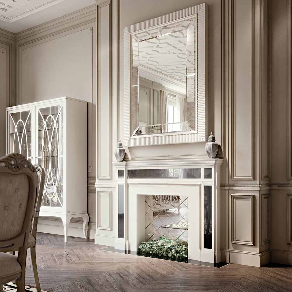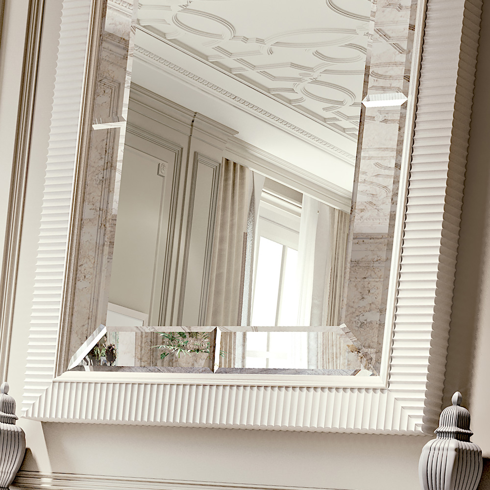 Offering the ultimate in luxury and glamour, bevelled glass mirror, with antiqued mirrored bands and a exquisite ribbed style white lacquered frame. Ideal for over a fireplace, hallway or luxurious bedroom setting. Can be hung landscape or portrait, creating two dramatically different effects. Alternative finishes and customised sizes are available to order, to create beautiful, bespoke pieces to fit your interior perfectly. Prices will vary.