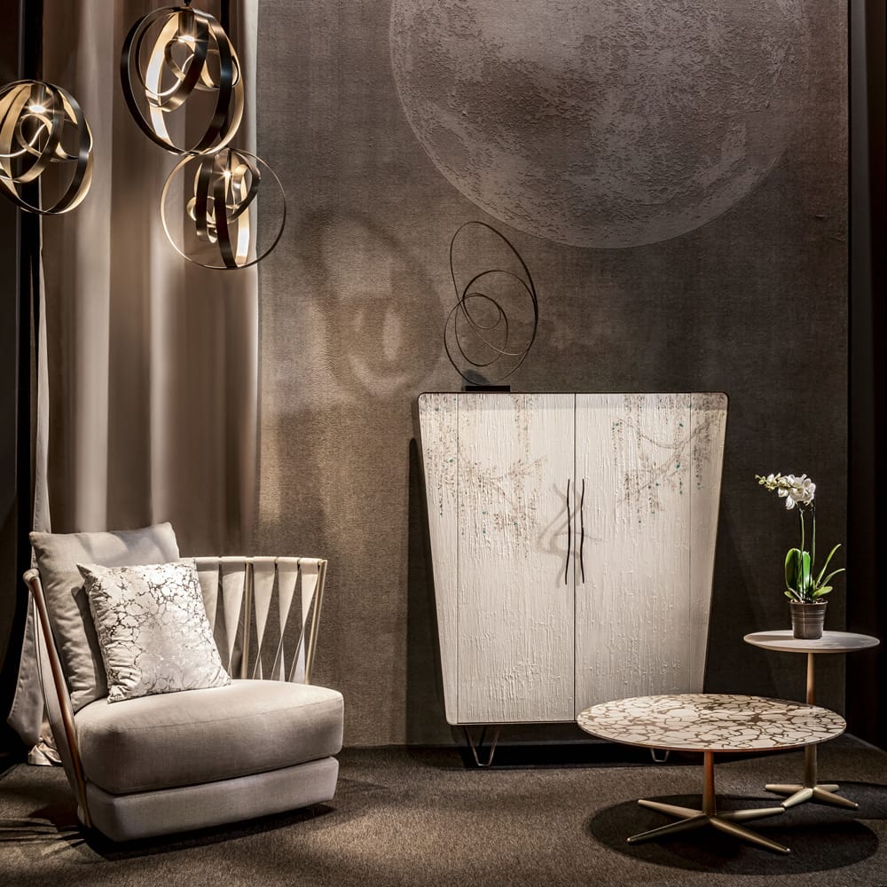 A remarkable iron structure, beautifully decorated by hand in a ‘wisteria’ finish by Italian artisans in the utmost of contemporary styling. For that, a light background of liquid plaster is applied in a rustic fashion as a base where mother-of-pearl flowers and branches of wisteria are painted by hand following the textured theme. A statement. The exquisite design, feature legs and handles are created in iron and finished in a fabulous bronze patina finish, with a lavish matt lacquered blue interior boasting elegantly polished glass shelves. Height 145 cm x width 120 cm x depth 49 cm. Weight 162 kg. Available in alternative luxury finishes and bespoke sizes by request. Prices will vary.