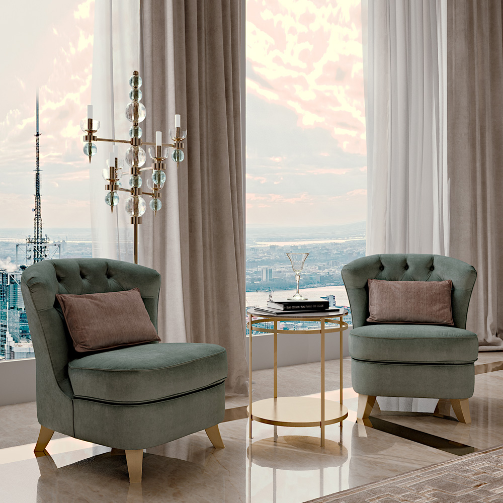 The Italian Designer Button Upholstered Art Deco Inspired Chair to suit both a classic or contemporary interior. Classic Art Deco inspiration meets timeless glamour. Ideal for those who have an eye on the classics but also enjoy the comforts of modern living. A touch of sophistication and opulence, creating the most striking of outlines indeed; perhaps one of the most recognisable features of Art Deco. Perfect seating paired with a side table as shown here, as an occasional chair in a bedroom or as a welcome in any hallway. Above all truly versatile. Curved legs in the finest gold leaf finish, completed with button and smooth upholstery to the highest standards in a high quality sage green velvet.