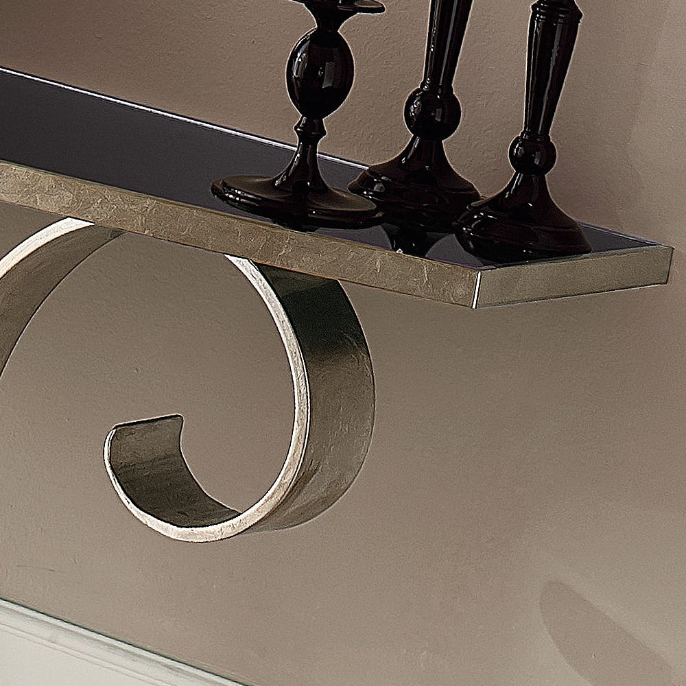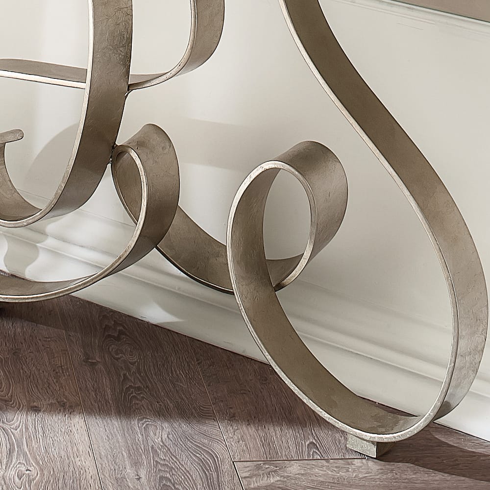 This remarkable console boasts a solid 10 mm thick table inset top in a beautiful bronzed mirrored finish. Complete with a beautiful contrasting contemporary base beautifully shaped, hot-bent and welded together into a striking swirl-style design by Italian Artisans. This exquisite structure features a stunning champagne silver leaf finish. Height 95 cm x width 130 cm x depth 38 cm. Available in alternative luxury finishes such as a brown marble top and gold leaf finish, and bespoke sizes available by request. Prices will vary.