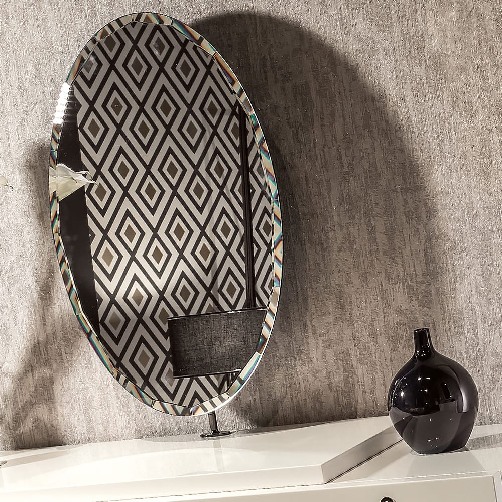 An exquisite overlapping wooden framework shown here finished in a high gloss ivory lacquer. Beautifully nestled on striking legs in a metallic iron finish of varying heights, creating a fabulous focus. Additional features include a striking oval mirror, and drawer fitted with a soft-close mechanism for effortless closing. Completed by tear-drop style metallic iron pull handles. Height 76 cm x width 150 cm x depth 50 cm, overall height including mirror 156 cm. This dressing table is available with alternative finishes, including a cream oak finish, and also legs and handles finished in bronze or pale gold. Also available without the oval mirror, making it suitable as a console or desk for any office or study space. Prices will vary.