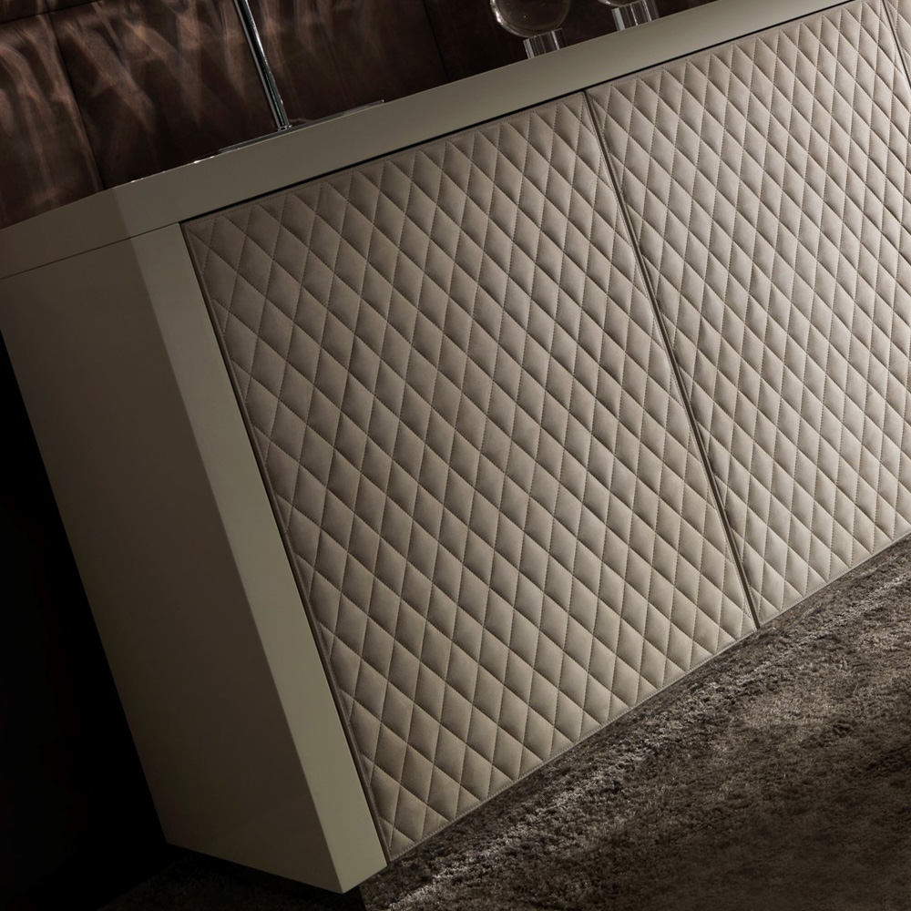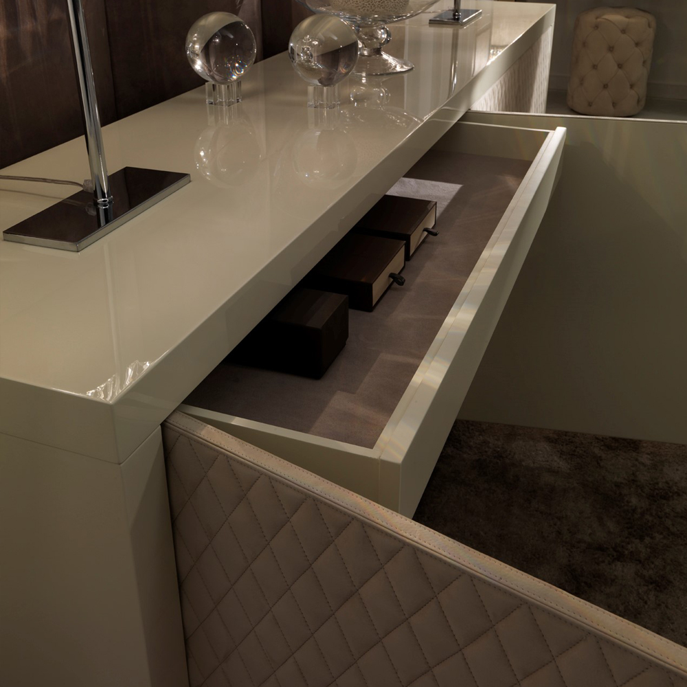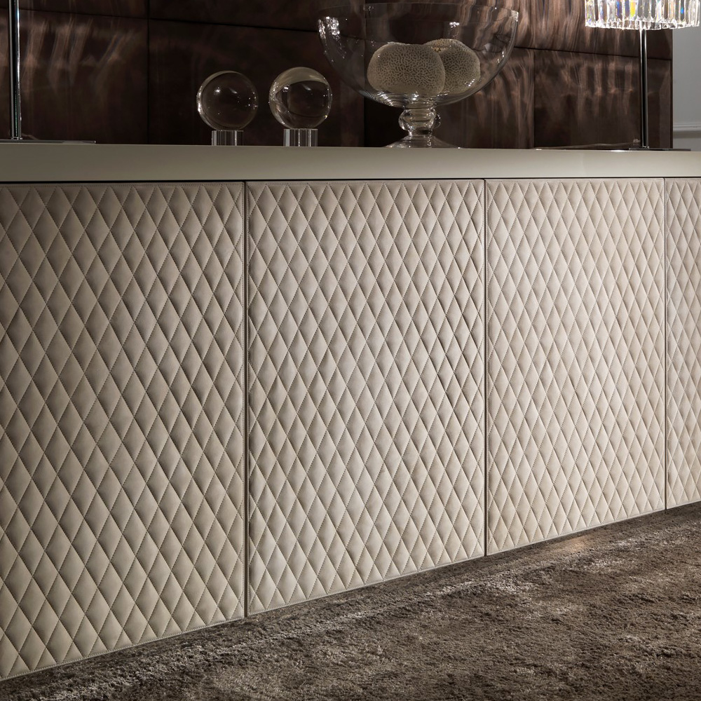 The Italian Designer Lacquered Quilted Leather Sideboard with 4 doors and 2 internal soft close mechanism drawers. A truly stunning statement for any room in the house. Striking in any setting, the ultimate in a stylish and glamorous storage solution. As comfortable in a dining room, bedroom or study as it is as a welcome in an entrance hallway.