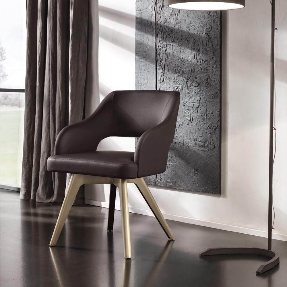 Height 77 cm x width 58 cm x depth 59 cm, seat height 44 cm. An exquisite wooden statement armchair, superbly upholstered in a sublime brown leather. A striking classic vintage-inspired design, boasting a distinctly shaped seat. Padding to the seat and armrests for the ultimate in style and comfort. Beautifully nestled on statement vintage-inspired metal legs, in a stunning brushed brass finish. A versatile design, making a striking office chair, dining chair, or as a stunning welcome in a hallway. Alternative luxury upholstery and finishes available, including a sumptuously quilted nubuck leather and legs in polished bronze. Bespoke sizes available on request. Prices will vary.