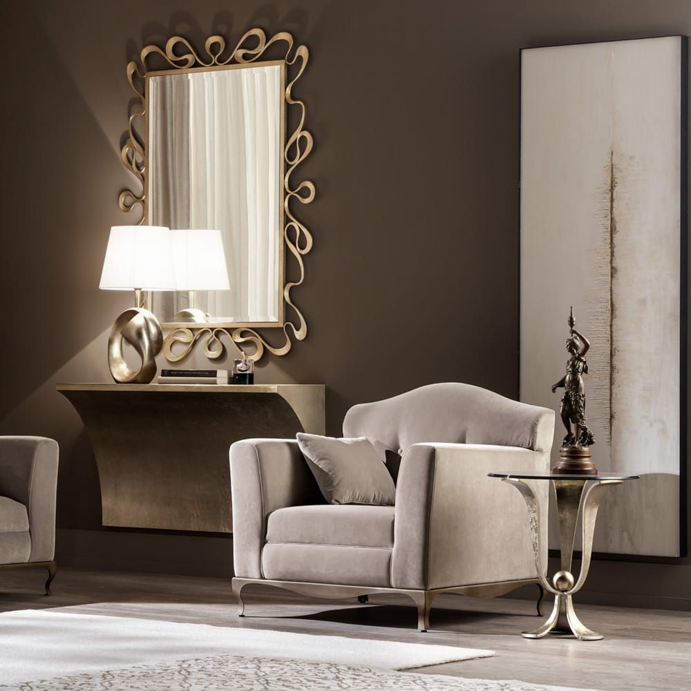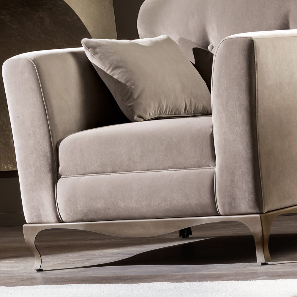 A solid metal structure, laser cut and curved to combine the beautifully shaped feet. Completed in a champagne leaf finish. Beautifully padded, upholstered and button upholstered with stitch detail by Italian master craftsmen to the highest standards in a luxurious mink nubuck leather of the finest quality. Height 82 cm x width 85 cm x depth 78 cm, seat height 40 cm. Weight 30 kg. The scatter cushion is not included. Available in an array of alternative luxury upholstery options, including traditional and faux leathers, suedes and nubucks together with the feet in various finishes such as silver and gold leaf, mother of pearl and lacquers. Bespoke sizes available upon request. Prices will vary.