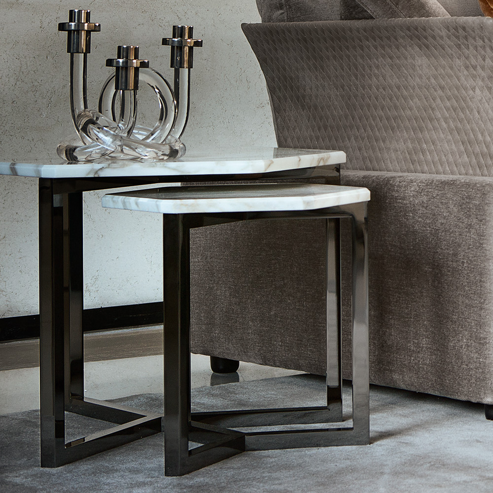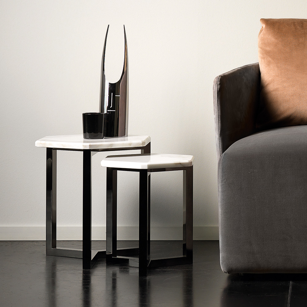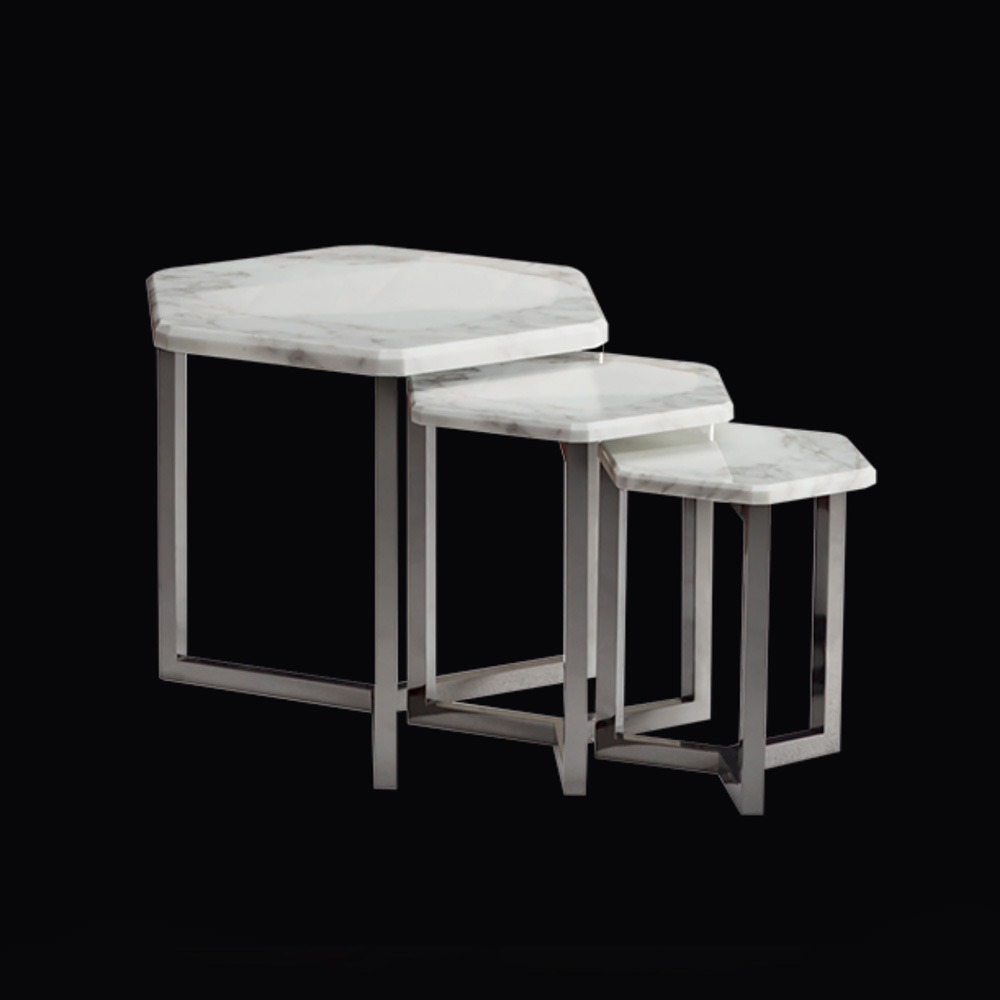 The Italian Designer Nest Of Marble Coffee Tables with their statement Hexagonal marble tops are a simply stunning addition to any setting. The perfect union of materials, a harmony of forms. A luxurious contemporary combination that adds a unique twist on what we know traditionally when we consider a nest of tables.