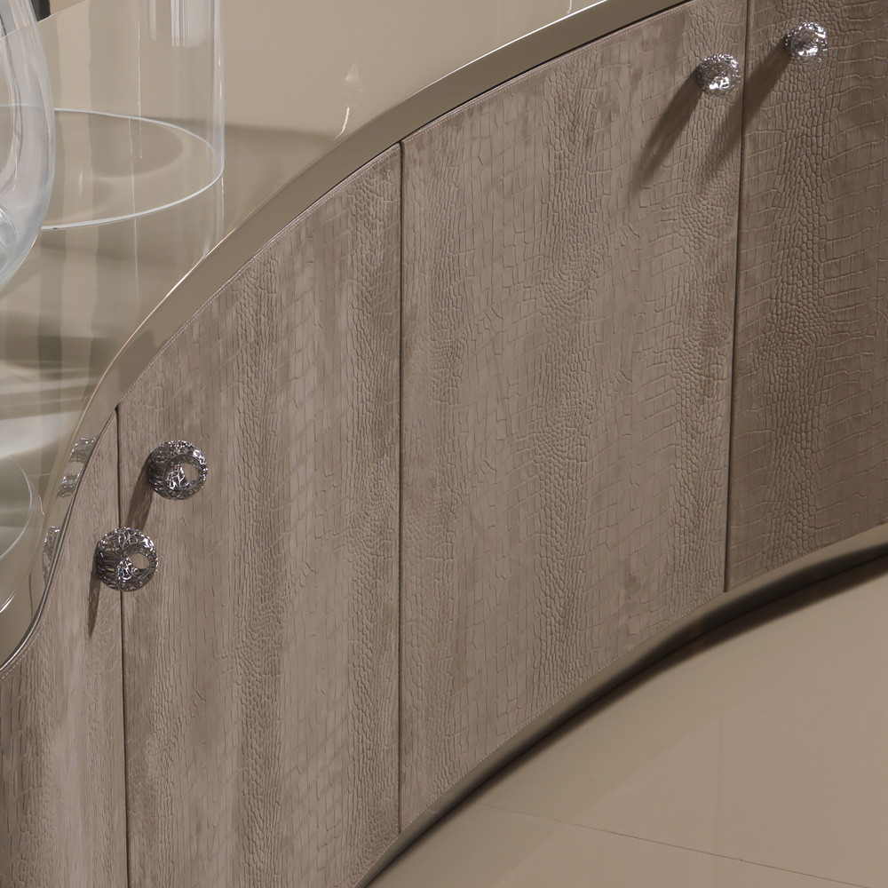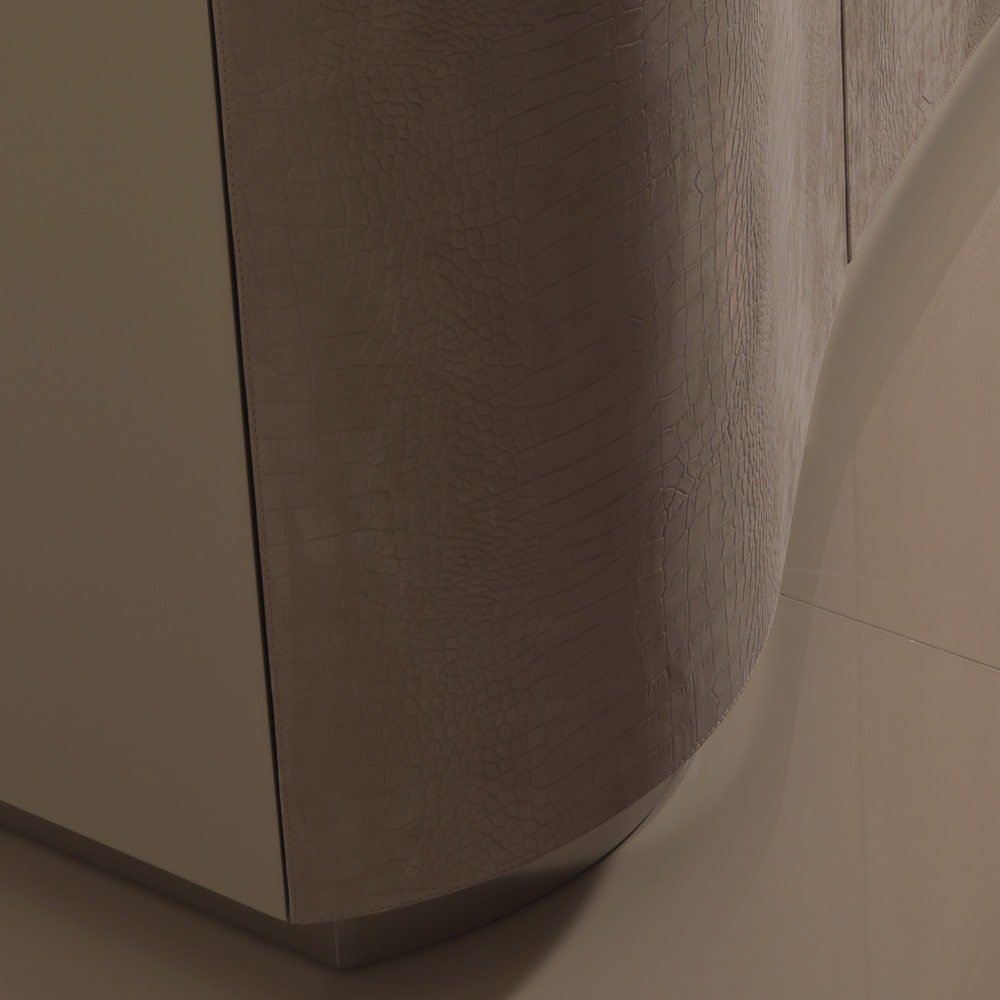 Shown here in a luxurious taupe RAL lacquered finish, together with striking polished stainless steel plinth style base. The 4 doors are upholstered in a high quality nubuck alligator embossed pattern leather, completed with striking laser perforated silver handles feature handles.