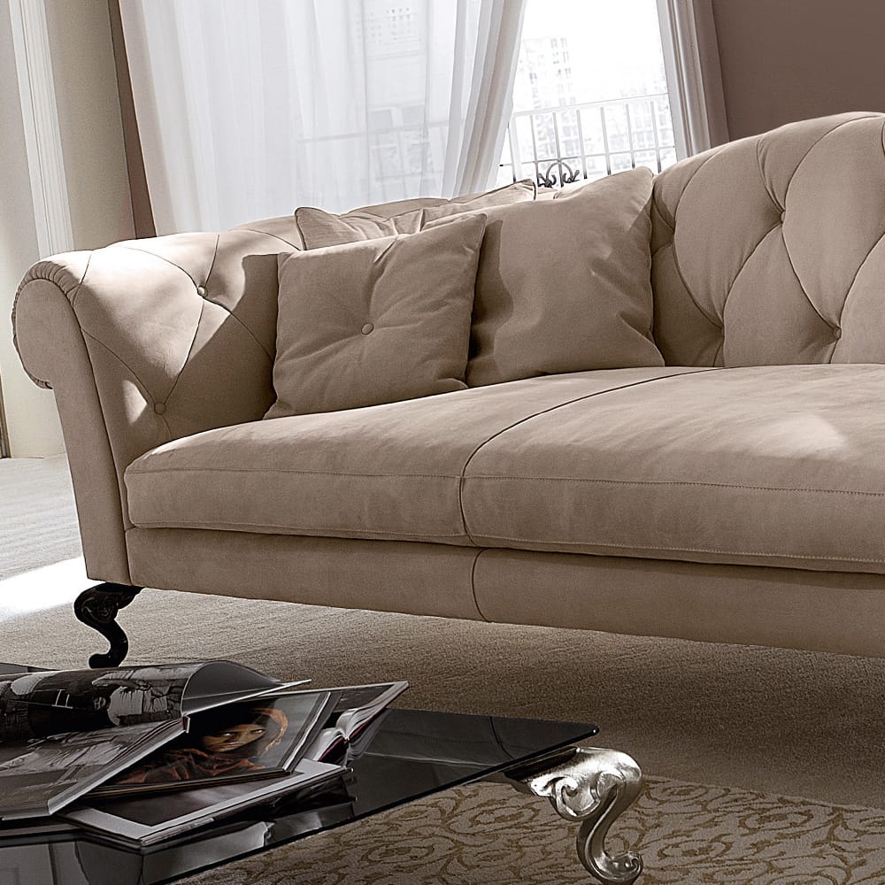 A solid structure beautifully padded, upholstered and button upholstered with stitch detail by Italian master craftsmen to the highest standards in a luxurious taupe nubuck leather of the finest quality. Complete with the most refined rococo style aluminium legs in a contrasting high gloss black lacquered finish. Height 85 cm x width 250 cm x depth 110 cm. Weight 134 kg. The 4 decorative scatter cushions are included, and the seat cushions are removable. Available in an array of alternative luxury upholstery options, including traditional and faux leathers, suedes and nubucks together with the feet in various finishes such as silver, champagne and gold leafs, mother of pearl and lacquers. Bespoke sizes available upon request. Prices will vary.