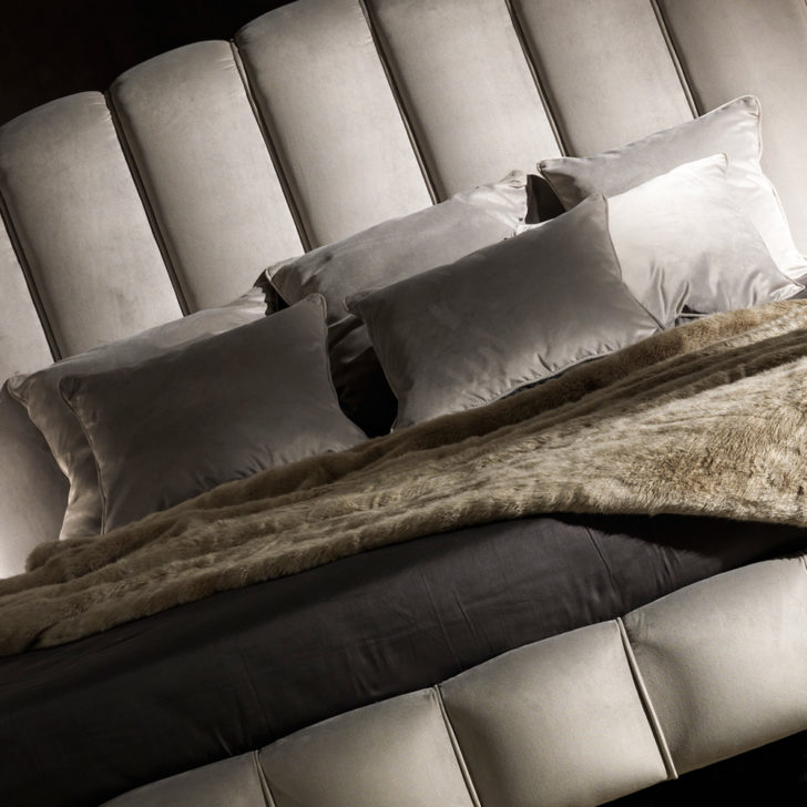 The High End Italian Padded Nubuck Leather Bed. A touch of glamour and style for any bedroom, adding the utmost in contemporary luxury and extravagance to any setting. Creating a truly indulgent atmosphere. The finest padded and panelled upholstery with exaggerated piping detailing to the statement tall headboard and bed base in a high quality soft Italian nubuck leather on polished stainless steel hidden feet.