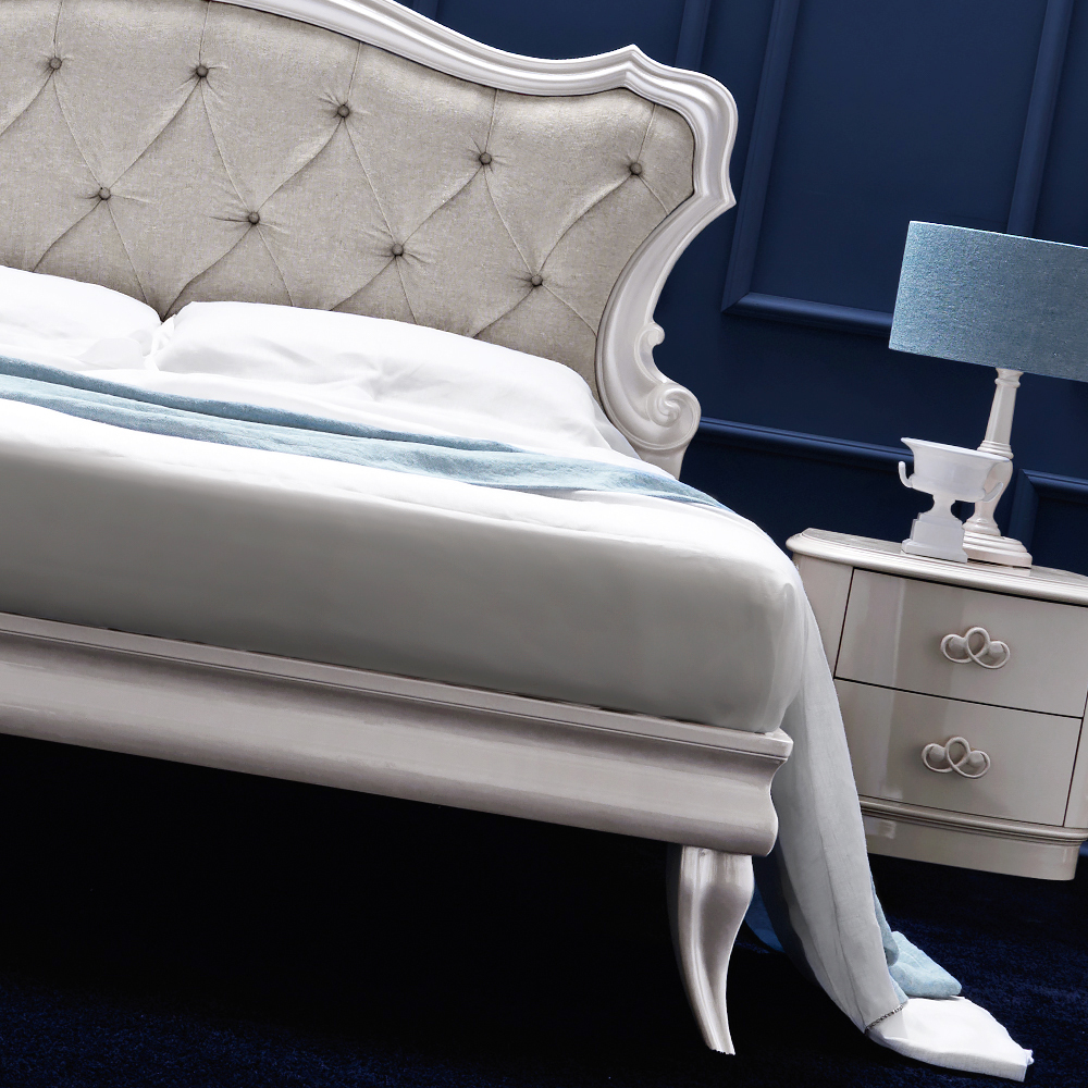 Italian Designer Pearl White Upholstered Bed. This seductive bed uses gorgeous finishes and textures to make an enchanting statement. The exquisitely carved headboard bed rail and delicate feet are all finished in a dreamy mother of pearl white lacquer. Affording romance and charm to your bedroom interior design. A super-soft fabric buttoned headboard completes the overall effect. Of superb quality this bed offers the ultimate in supreme comfort and style. Headboard is available finished in a variety of fabrics, including customers own, quilted or buttoned. Prices vary. Overall height is 136 cm. Dimensions to fit the standard 165cm x 190 cm mattress, bed width 183 cm x length 202 cm. Overall width an additional 18 cm to mattress size and overall length an additional 12 cm to mattress size. Available to fit mattress sizes as shown. Special sizes available on request. Throws, linen, cushions and bolster cushions sold separately. Luxury mattress to fit these dimensions sold separately by Hypnos available with free delivery if ordered with your bed. This bed is part of a bedroom set, also pictured and available. Made to a world class standard. Please allow 9 weeks for dispatch. Made in Italy with a unique attention to detail, creating a contemporary atmosphere for your home.