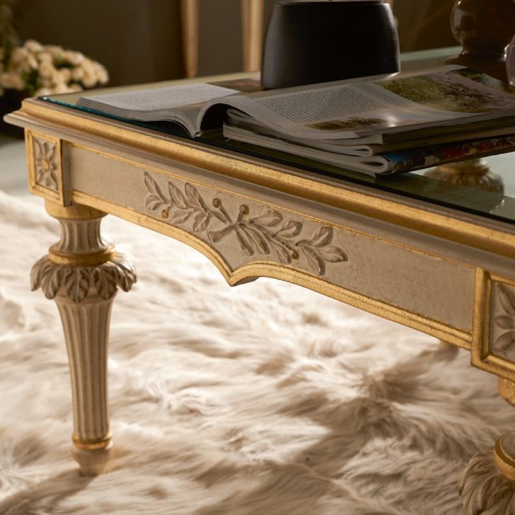 Shown here in an antique ivory finish with hand painted gold detailing accentuating the ornate frame structure and enhancing the beauty of the intricate carvings. A feature square glass table top insert completes this fabulous design. Height 47 cm x width 76 cm x depth 77 cm. Available to order in different colours, sizes and finishes by request. Prices will vary.