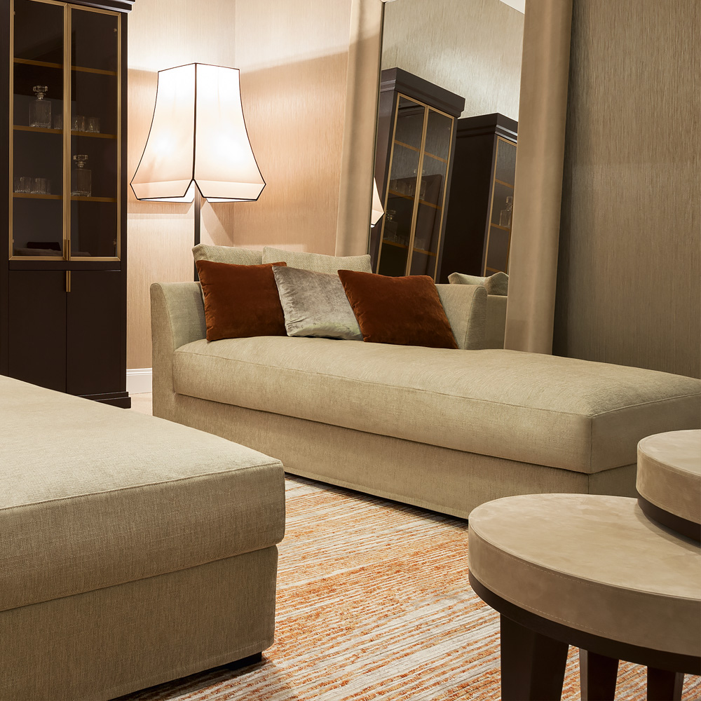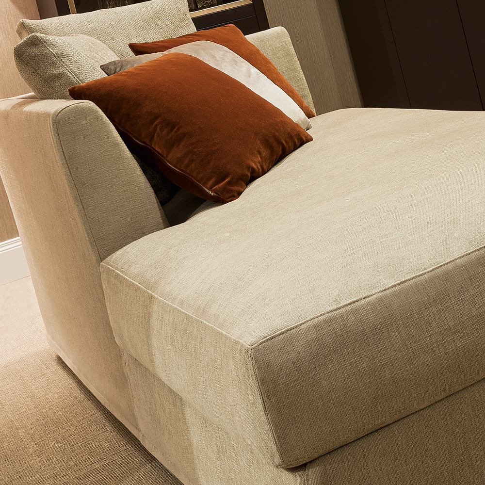 This luxurious design with two loose back cushions is superbly padded and upholstered in a high quality taupe textured luxury fabric, supported by understated wooden feet in a mocha finish. Height 70 cm x width 190 cm x depth 95 cm, seat height 42 cm. Back cushions, 50 cm x 50 cm. Available as left or right facing, to suit your interior design. Both the frame and cushion covers are removable. Various other finishes, leathers and fabrics including customers own are also available by request. Prices will vary.