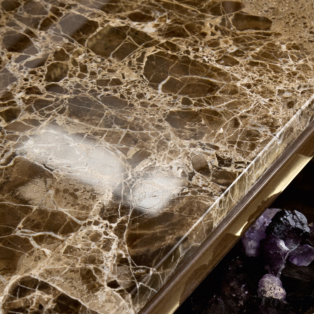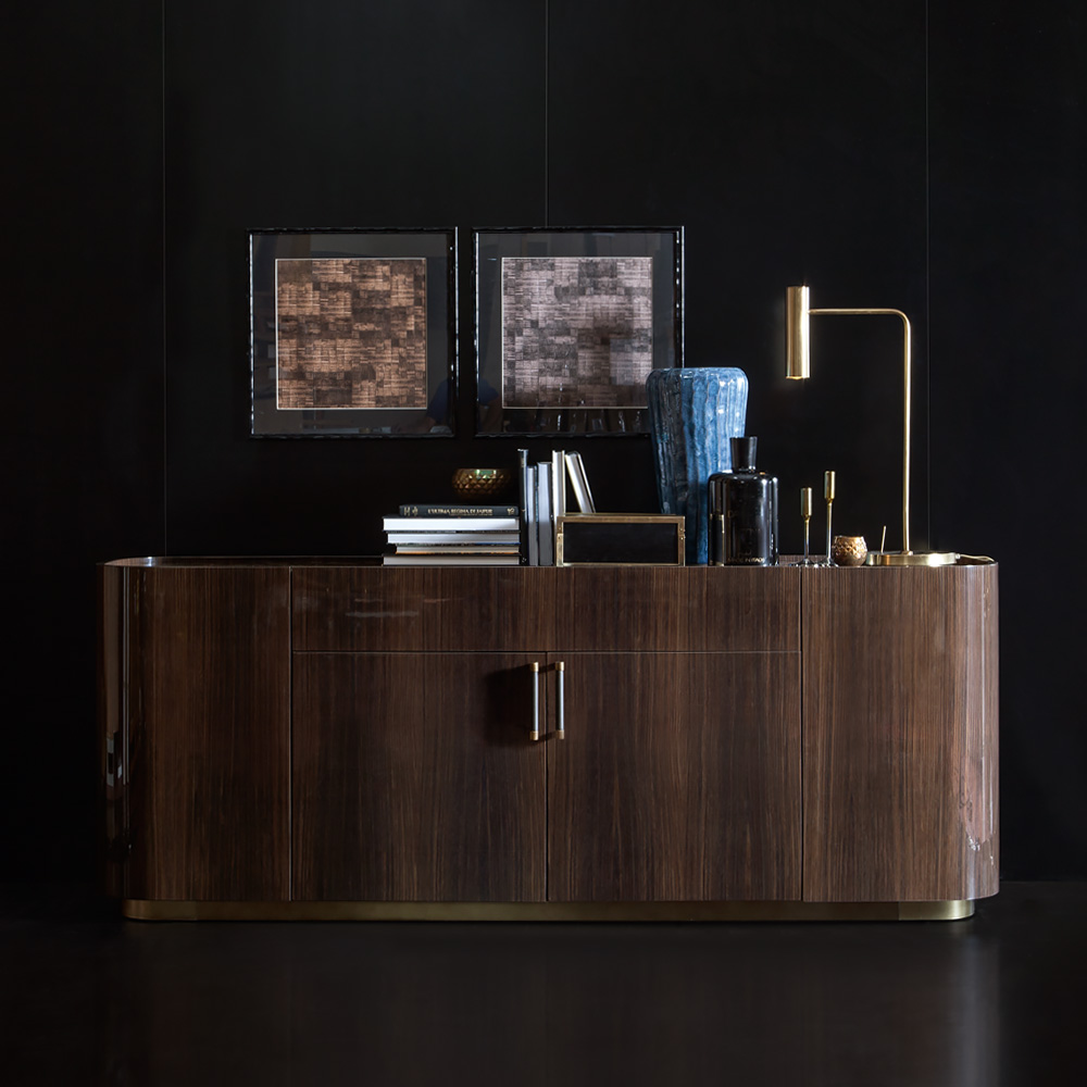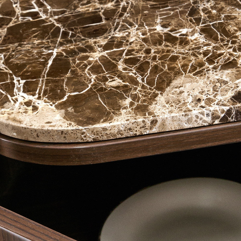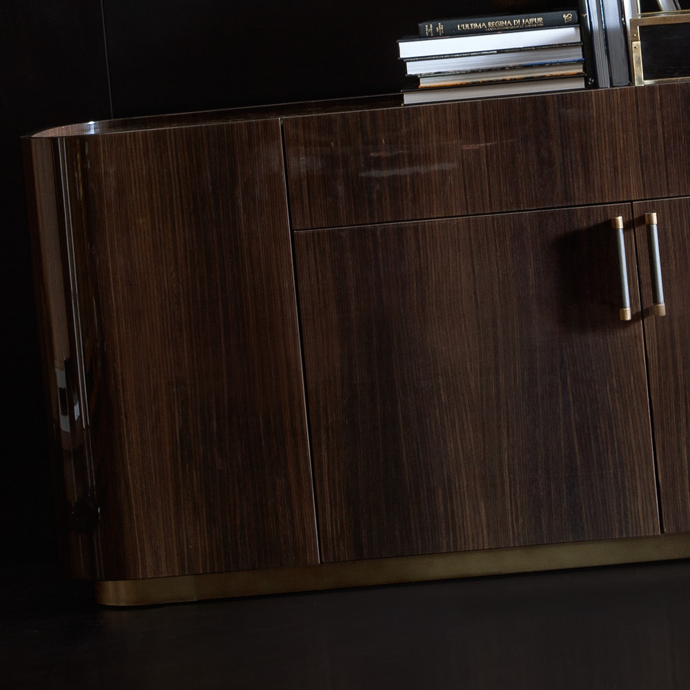 A wooden structure with a high gloss Dark walnut veneer finish, inside and out. Housing an inset Emperador marble top with exquisite curves. Two feature lined hidden drawers on soft metal runners. And 2 central cupboard doors, with 2 curved end cupboard doors offer the ultimate in storage solutions. Internal shelves, brass handle and plinth base detailing complete this fabulous design. Use in any setting for a functional chic accent. Weight 215 kg. Available in alternative finishes, with a leather top and in various sizes by request. Prices will vary.