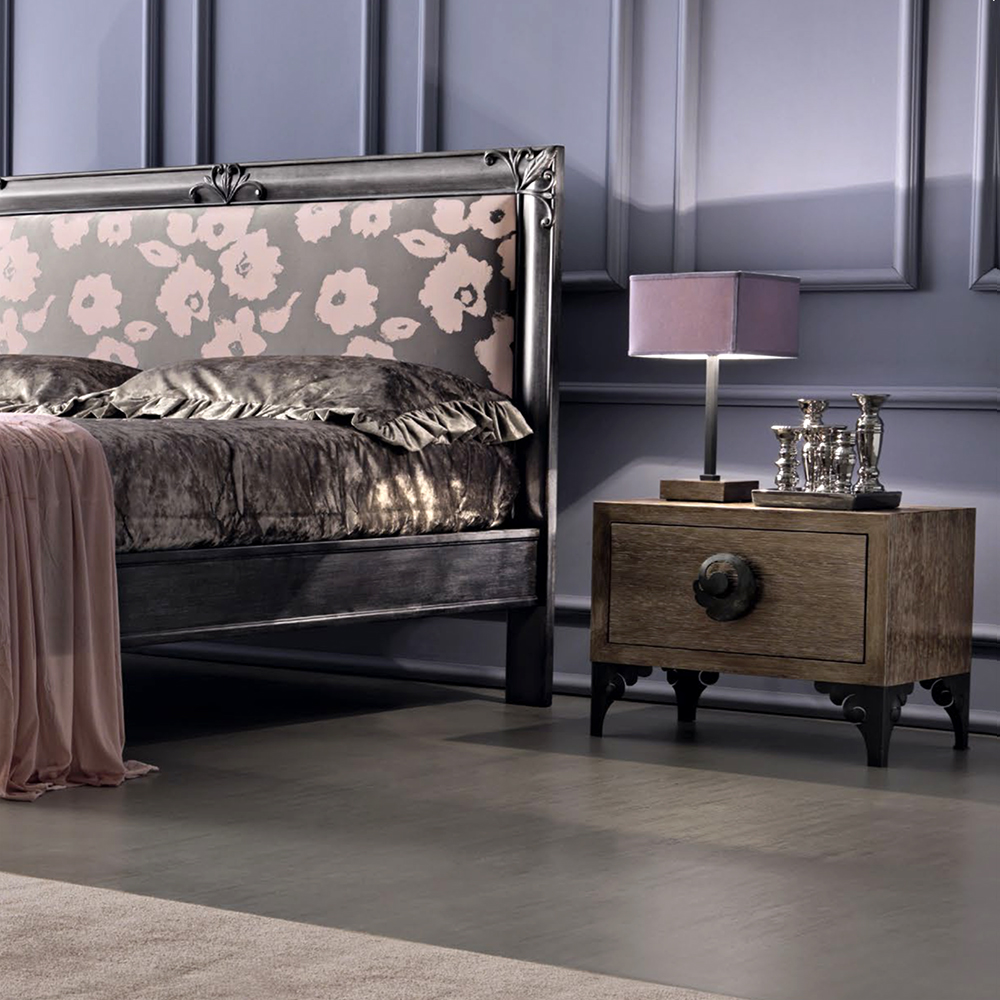 The Italian Designer Wooden Bedside Cabinet with drawer is shown here in a sandblasted wooden finish. Perfectly complemented with a natural ornate iron handle and beautifully curved statement iron legs. This beautiful bedside table is the most stunning understated addition and stylish storage solution. Use as a modern side table or unique small chest of drawers in any room in the house. Adding style and sophistication to any setting. Truly versatile. Height 47 cm x width 60 cm x depth 40 cm. Alternative finishes, woods, leg styles and customised sizes are available to order.