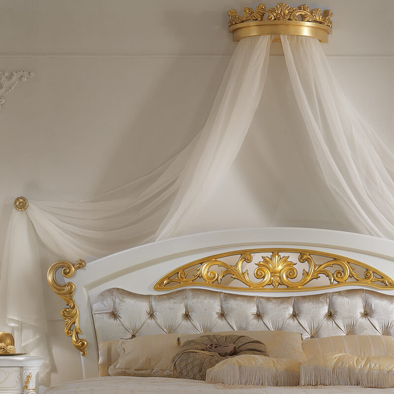 The Italian Elaborately Carved Button Upholstered Bed is shown here in a fresh white painted finish and button upholstered in a luxurious oyster velvet. Embellished with natural soft painted brush stroke designs and beautiful contrasting bright gold leaf hand painted detailing to the carved elements of the curved headboard and footboard. Paired here with the Italian Gold Leaf Canopy Crown with matching gold leaf rose hanging hooks and soft white sheer drapes, creating a truly magical atmosphere. A touch of grace and style for any bedroom, adding the utmost in glamour and extravagance to any setting. Carved from solid wood, in two sizes as standard. For a 180 cm x 200 cm mattress, which are super king dimensions – overall bed height 135 cm x width 215 cm x length 212 cm and for a 160 cm x 200 cm mattress – overall bed height 135 cm x width 195 cm x length 212 cm. Alternative sizes, finishes, drapes and with a simple wooden headboard available on request. Available as a headboard only if required. Bolster, throw and cushions sold separately. This bed is part of a set as photographed, all of which is also available.