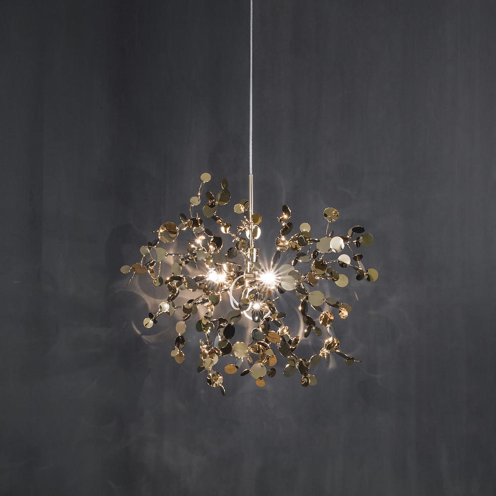 The Italian Gold Plated Designer Pendant Light. This engaging design uses a glimmering cloud of gold discs which have been formed meticulously by hand into clusters. The smooth discs create multiple angled surfaces in which to reflect the light creating a soft shimmering glow.