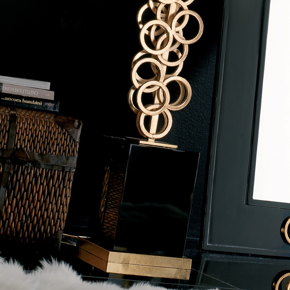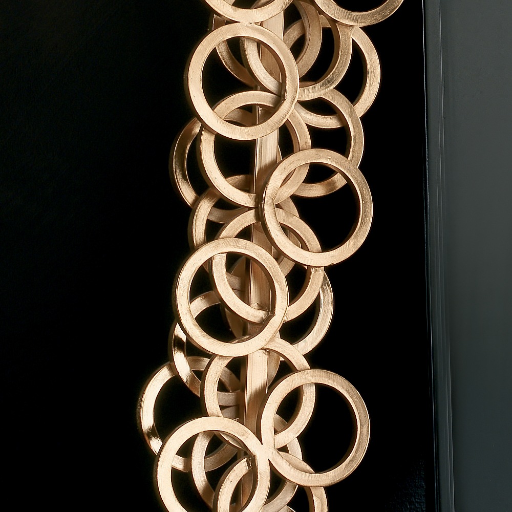 This superb design draws its own attention. The primary focus is a stunning forged iron frame consisting of layered patterns of gold plated rings, together with a gloss black lacquered base and gold plinth. Complete with a gold-lined modern black chintz shade, altogether offering a superbly confident striking design.
