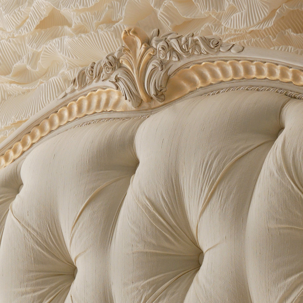 The Italian Ivory And Gold Luxury Reproduction Bed finished by artisans with a luxurious ivory painted frame and hand painted bleached gold details. Button upholstered to the highest standards in a superb ivory linen. In 3 sizes as standard. To fit mattress 170 cm x 200 cm, overall size height 171 cm x width 202 cm x depth 210 cm. To fit mattress 180 cm x 200 cm, overall size height 171 cm x width 202 cm x depth 210 cm. And to fit mattress 200 cm x 200 cm, overall size height 175 cm x width 222 cm x depth 210 cm. Other sizes are available to order with alternative fabrics and leather, including customers own fabric, frame colours and finishes and also as a headboard only. Prices will vary.