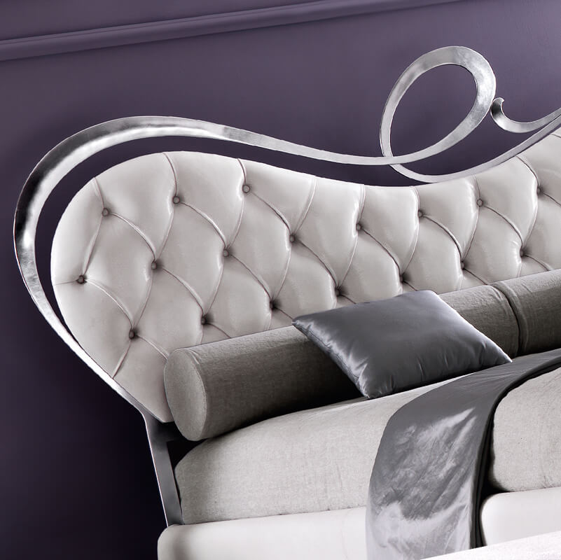The Italian Leather Button Upholstered Swirl Headboard adds the ultimate in contemporary style to any bedroom. Shown here in a white soft leather button upholstery and silver leafed finish to the statement ornate swirled frame. Overall headboard height is 141 cm. Overall width additional 49 cm to mattress size. Available to fit mattress sizes as shown. Alternative fabrics, frame colours, finishes and special sizes available on request. Available as a complete bed if required. Bed frame shown here in a matching white soft leather upholstered base with a silver leafed finish to the shaped legs. Overall bed length 216 cm for all sizes. Luxury mattress to fit these dimensions sold separately by Hypnos available with free delivery if ordered with your bed. This headboard is part of a bedroom set, also pictured and available. Made to a world class standard. Please allow 9 weeks for dispatch. Made in Italy with a unique attention to detail, creating a contemporary atmosphere for your home.