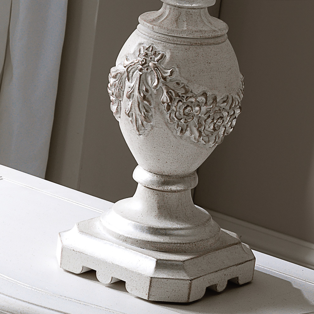 The Italian Ornate Carved Large Pleated Shade Table Lamp, is the perfect addition to any setting indeed. Truly versatile, and above all of notable classic style. Shown here in an antiqued white finish together with hand painted silver detailing enhancing the intricate carvings. Completed with an ivory pleated shade with fine trim detailing. Also available in various colours, finishes, shade colours and without a shade too. Offering you the ultimate in versatility. Height 70 cm x diameter 50 cm. Uses 1 x E27 max 60 watt bulb, not included. This table lamp is shown here as part of a bedroom set, also pictured and available. Made to highest standards. Please allow 12 weeks for dispatch. The subtle finishes of the unique Florence Collection with every detail designed to be exclusive.