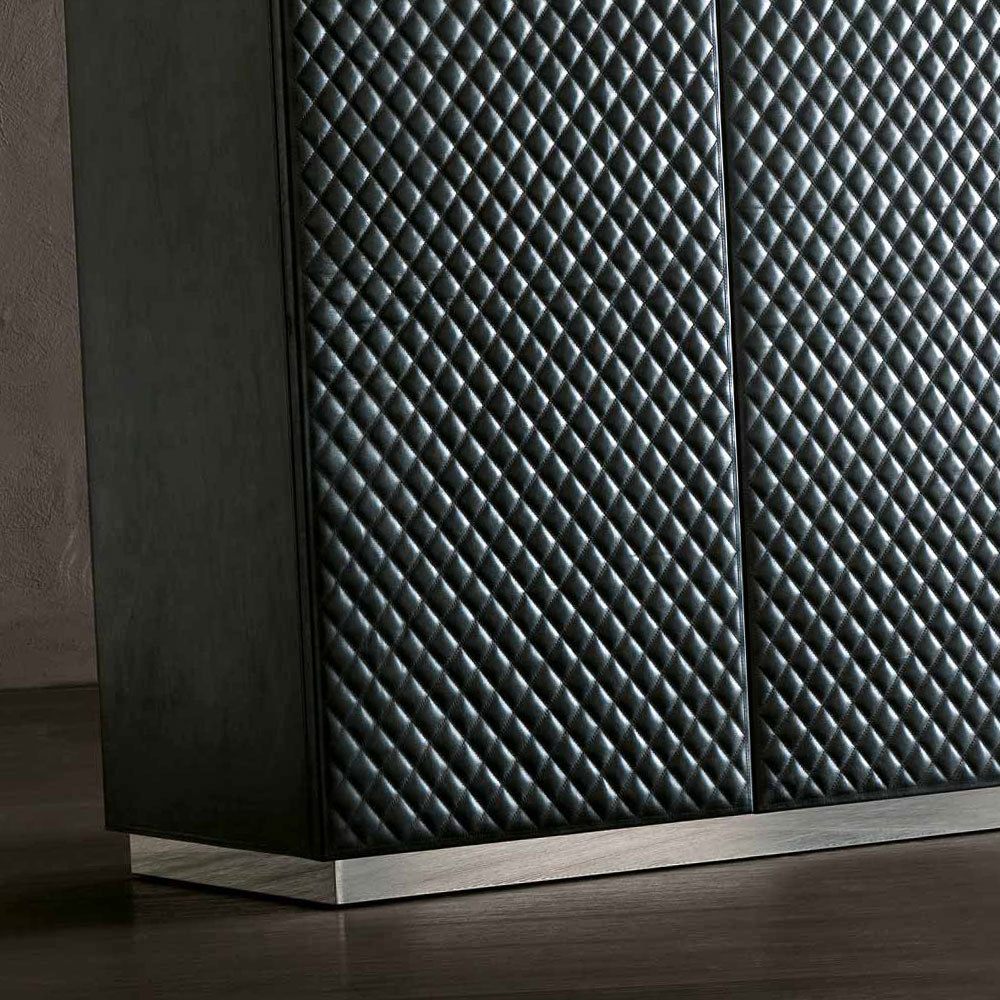 A wooden structure with a patterned leather upholstery finish of the finest Italian quality, with the defining feature being the quilted leather upholstery to the doors. Fitted with a push opening mechanisms to enhance the fabulous minimal look and feel. Internal configuration of two upper central drawers, pull out serving ledge and 8 compartments with glass shelves with a matt lacquered finish, and back panel in a mirrored finish. Supported by a contrasting stainless steel base. Weight 87 kg. Available in alternative finishes and various sizes by request. Prices will vary. Internal LED lighting is optional.