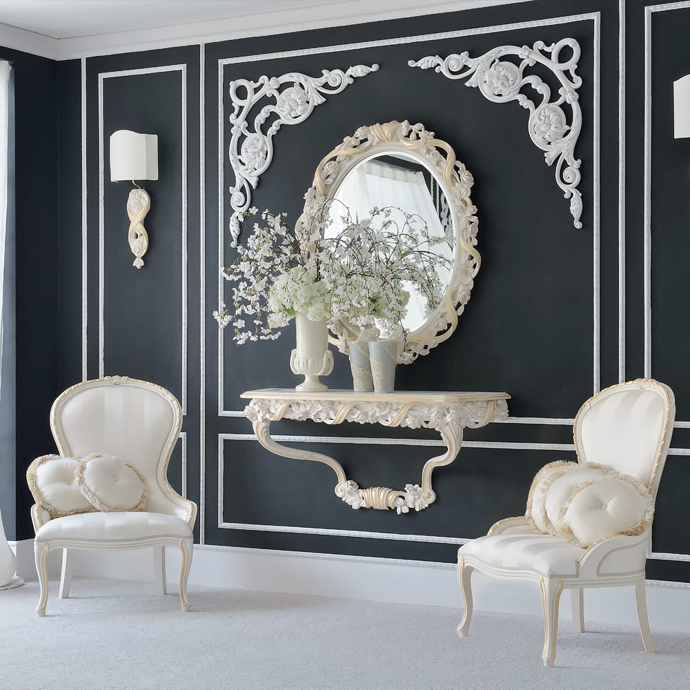 Italian Rose and Ribbon Oval Reproduction Wall Mirror. Ideal for over a fireplace or luxurious bedroom setting. Shown here in an ivory with hand painted bleached gold leaf detailing.