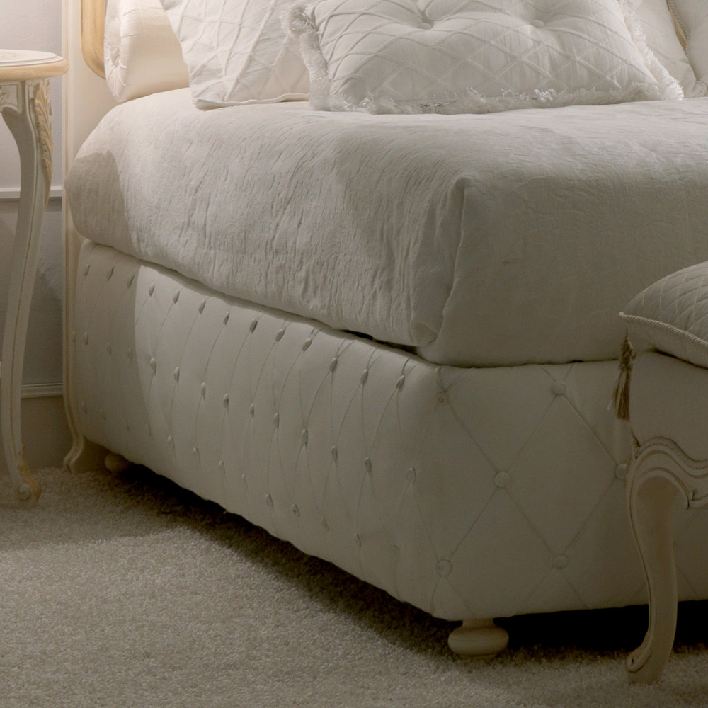 The Italian Rose Detail Luxury Bed finished by artisans with a luxurious painted frame shown in an antiqued ivory with bleached gold hand painted detail. Button upholstered to the highest standards with a high quality subtle patterned fabric to the headboard and base. Size shown to fit mattress 180 cm x 200 cm, overall size height 147 cm x width 187 cm x depth 209 cm. Other sizes are available to order with alternative fabrics and leather, including customers own fabric, frame colours and finishes and also as a headboard only. Prices will vary. Please note that the scatter cushions are available by request, but not included in the price.