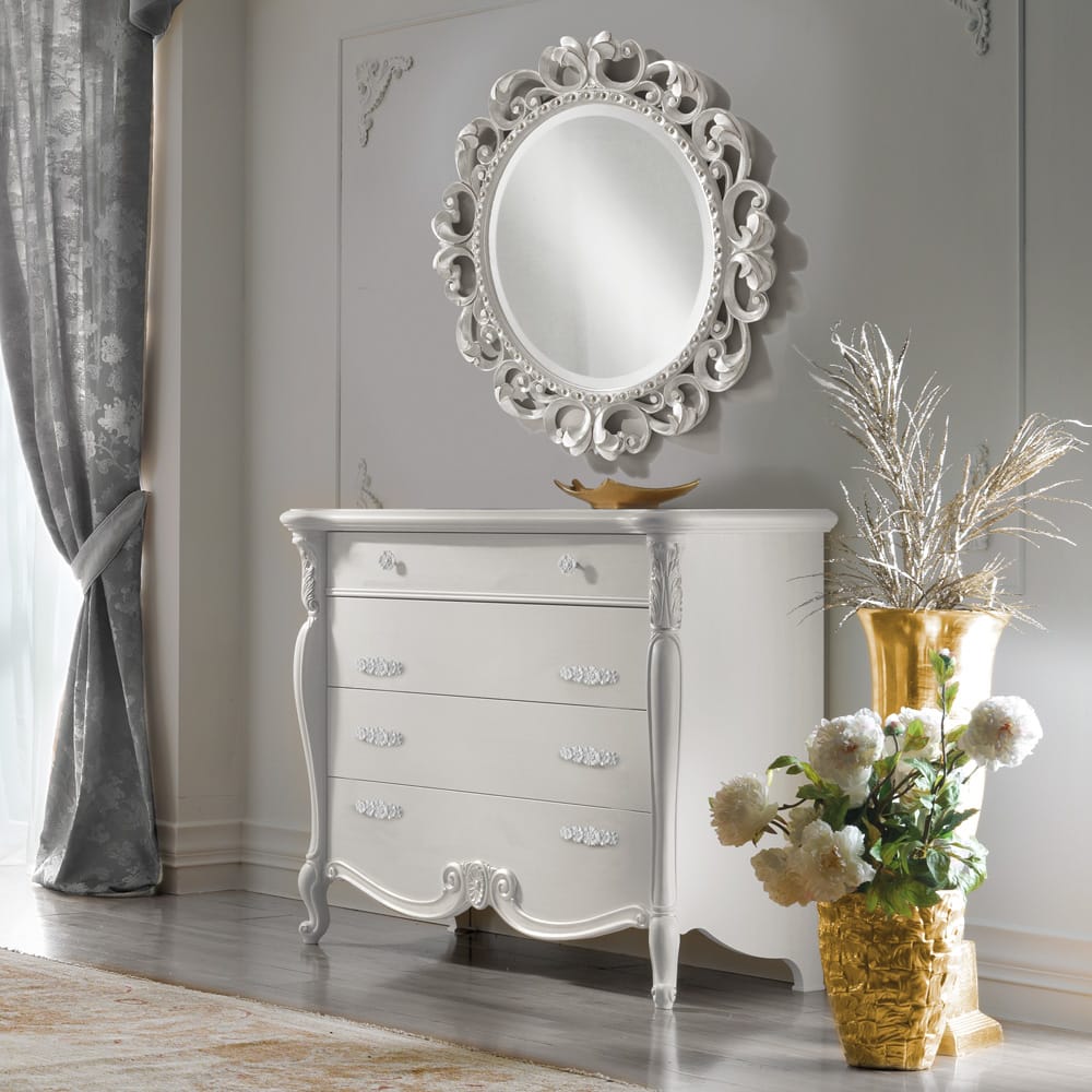The Italian Silver Leaf Carved Round Wall Mirror, carved from solid wood and shown here in a beautiful bright silver leaf painted finish. Offering an elaborate silhouette. A stunning statement mirror which adds more than a touch of luxury and glamour to any setting. Diameter 86 cm. Weight 11 kg. Alternative sizes and finishes are available on request. Prices will vary.