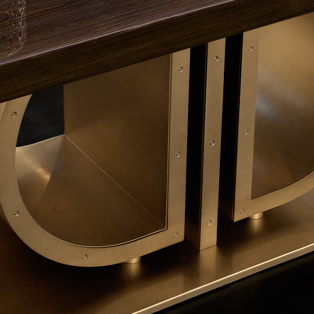 The table is a balance by design, giving the whole structure of these dimensions an unexpected lightness. A plinth style base supports a dynamic pedestal structure in a burnished brass finish with visible screw detail offering industrial tones. Beautifully completed by a striking Walnut veneered rectangular table top in a brushed glossy finish. Height 75 cm x width 220 cm x depth 105 cm. Weight 174 kg.