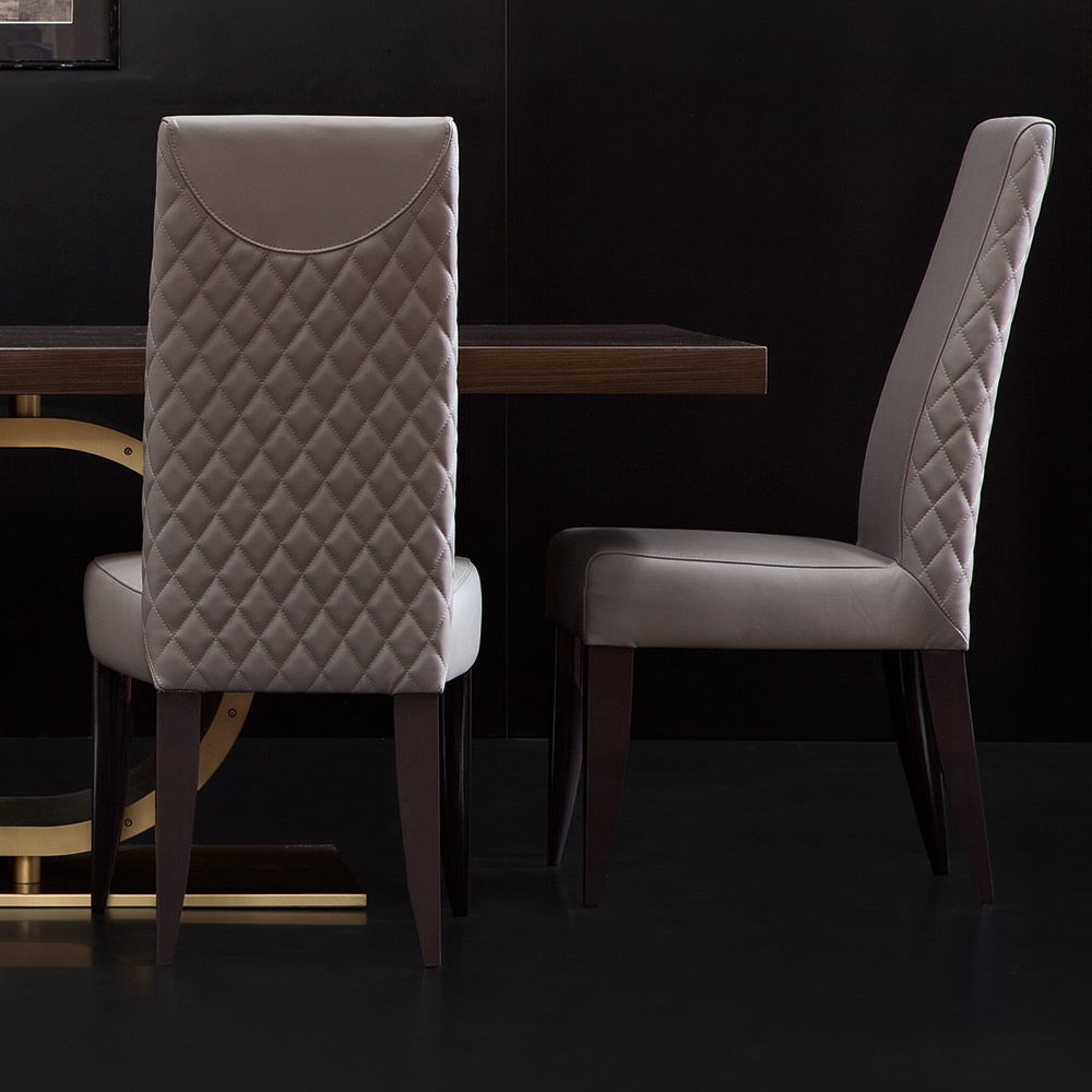 Paired here with the Exclusive High Backed Modern Italian Quilted Leather Dining Chair, height 105 cm x width 50 cm x depth 64 cm. A striking shape formed in solid beech wood, padded for supreme comfort and upholstered in the finest leather with the addition of quilting detail to the back panel. Legs finished in a brushed glossy smoked lacquer. Creating a truly fabulous focus.
