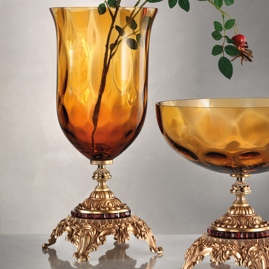 Beautifully detailed ornate brass structures with shimmering faceted glass and small rhinestone detail, in a satin gold finish. Supporting elegantly shaped bodies of amber glass hand blown in Tuscany. In 2 styles as standard. Vase, height 42 cm x diameter 19 cm – weight 3 kg and centrepiece style bowl at height 28 cm x diameter 28 cm – weight 2.5 kg. Available in a satin silver finish and glass colours such as amethyst, ruby and smoked by request. Prices will vary.