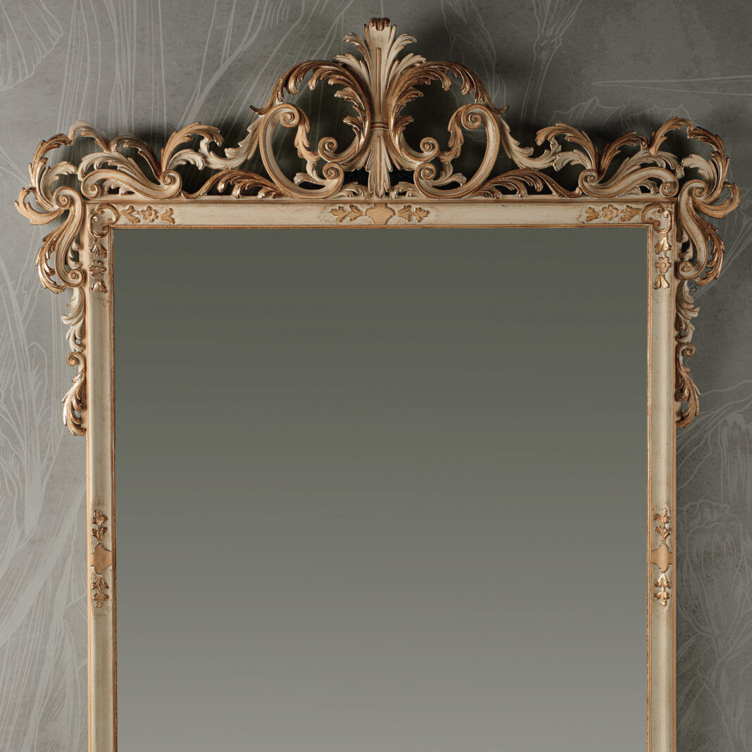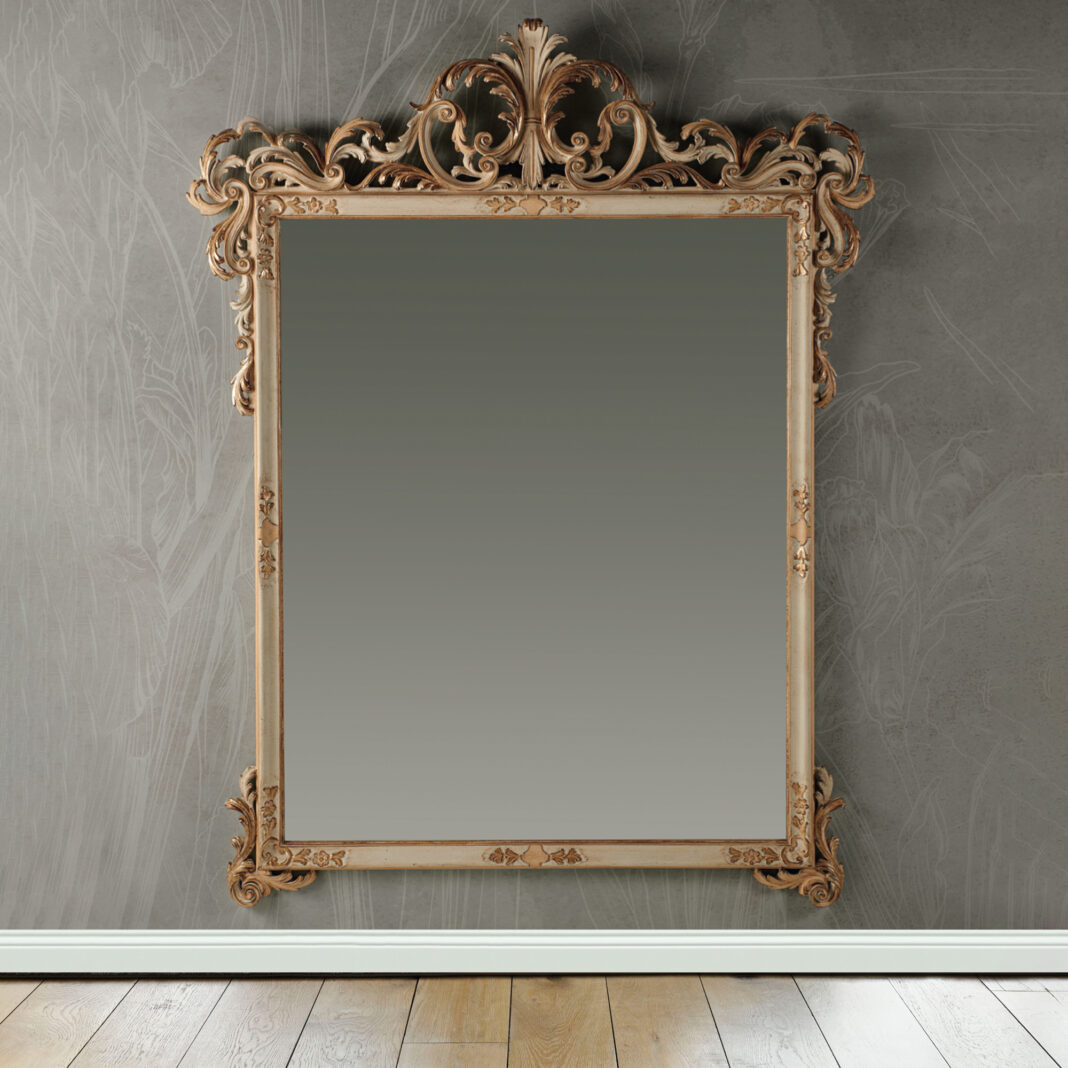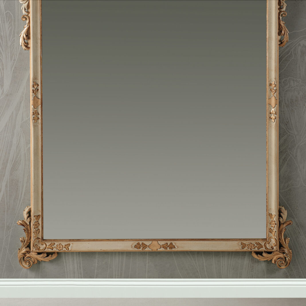 Striking in its dimensions and designed in a classic style making its intricate carvings its defining aspect. A beautiful vertical rectangular mirror encased in a wooden frame, shown here in an antique white and dove finish, together with beautiful hand painted accents of gold accentuating the intricate carved detailing. Alternative finishes and special sizes also available by request. Prices will vary.