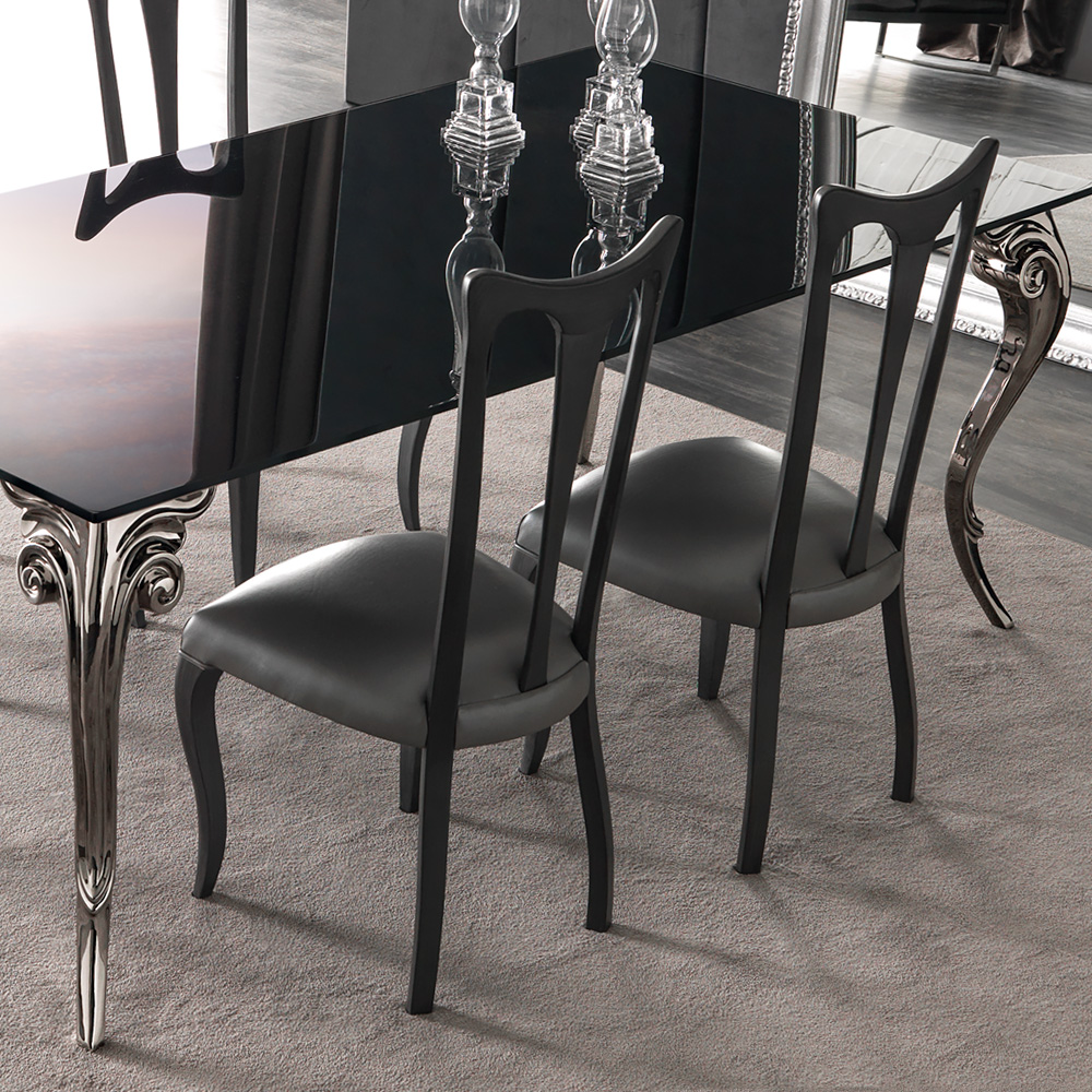 The Large Black Glass Dining Table Set is a statement for any dining area. A unique twist on what we know traditionally when we consider a glass dining table, creating a dramatic effect. A stunning large contemporary black lacquered glass table top, working in absolute contrast to the divine legs in bright nickel with their curves and elaborate design. These curved lines are exquisite. Table height 81 cm x width 220 cm x depth 110 cm. Available to order in a variety of alternative coloured tops including all RAL high gloss painted finish, leather, gold, silver and Champagne leaf and also in sand blasted solid oak. Other leg designs also optional. Paired here in perfect partnership with the curves of the High Backed Leather Designer Chair. In a black matt lacquered finish to the beautiful frame, with a padded upholstered seat in a high quality matching matt black Italian leather. Height 108 cm x width 51 cm x depth 57 cm. Also available in alternative frame colours, finishes and fabrics including customers own fabric. Prices vary. Available as a set or individually, also suitable for 6 chairs. Made to a world class standard. Please allow 9 weeks for dispatch. Made in Italy with a unique attention to detail, creating a contemporary atmosphere for your home.