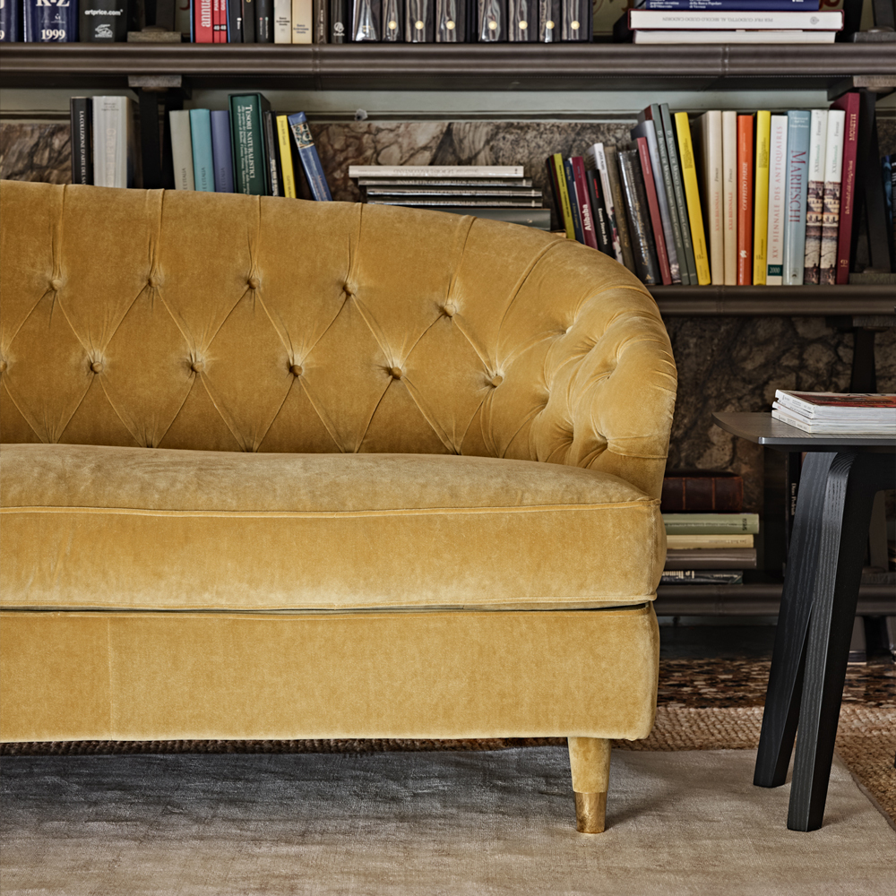 A solid wooden structure, with a crossed elastic belt spring system. Seat cushions in 100% goose down feathers. Padded in foam and memory foam in various different densities for the ultimate in luxurious comfort. Button upholstered to the highest standard in a fine quality rich gold velvet with stunning piping detail, continuing to the legs and completed with the most refined polished brass glides. In 2 sofa sizes as standard, height 80 cm x width 240 cm x depth 90 cm and height 80 cm x width 260 cm x depth 90 cm. Seat height 40 cm, seat depth 65 cm. Removable seat cushion covers in both fabric or leather versions. Alternative leathers and fabrics including customers own and in customised sizes. Prices will vary.