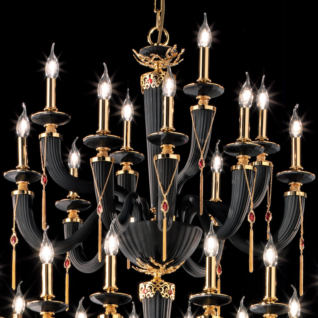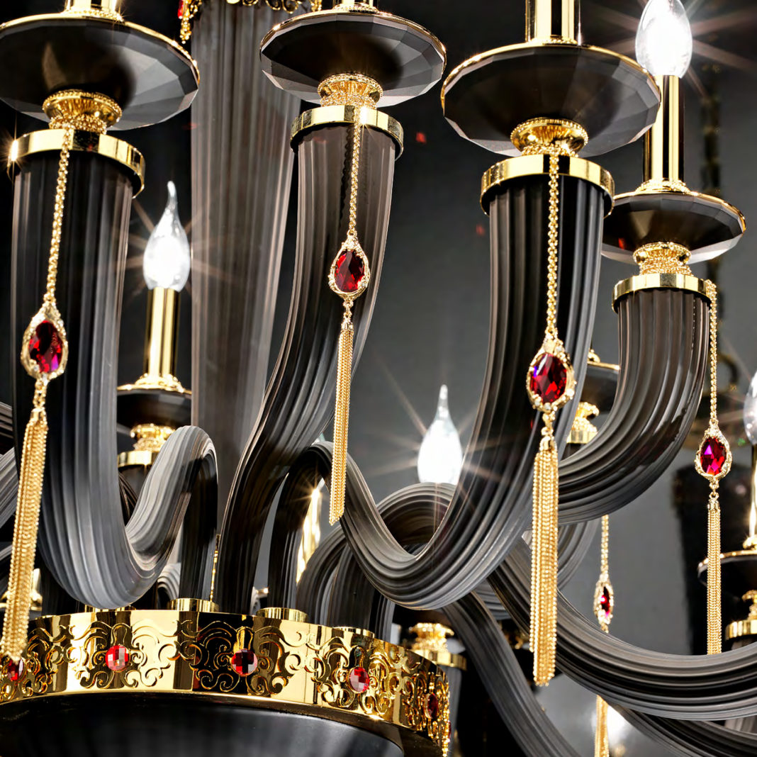 A three tier chandelier radiating from an elegant central base and creating a beautiful outline, an ornate brass structure in a polished gold finish is adorned with matt black ribbed glass from the Italian region of Veneto. Matt black faceted bobeches from Tuscany create a striking feature. Completed by handmade decorative chain and tassel elements in a 24K gold finish, embellished with dazzling Swarovski® crystal drops. Weight 54 kg – which requires 36 x max 28W E14 Bulbs. Bulbs are not included. Dimensions are plus hanging chain. Available with shades, in various sizes, a polished silver finish, in a matt red glass colour or with teal blue crystal drops by request. Prices will vary.