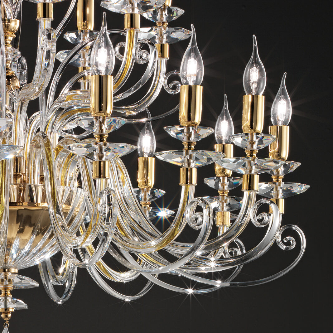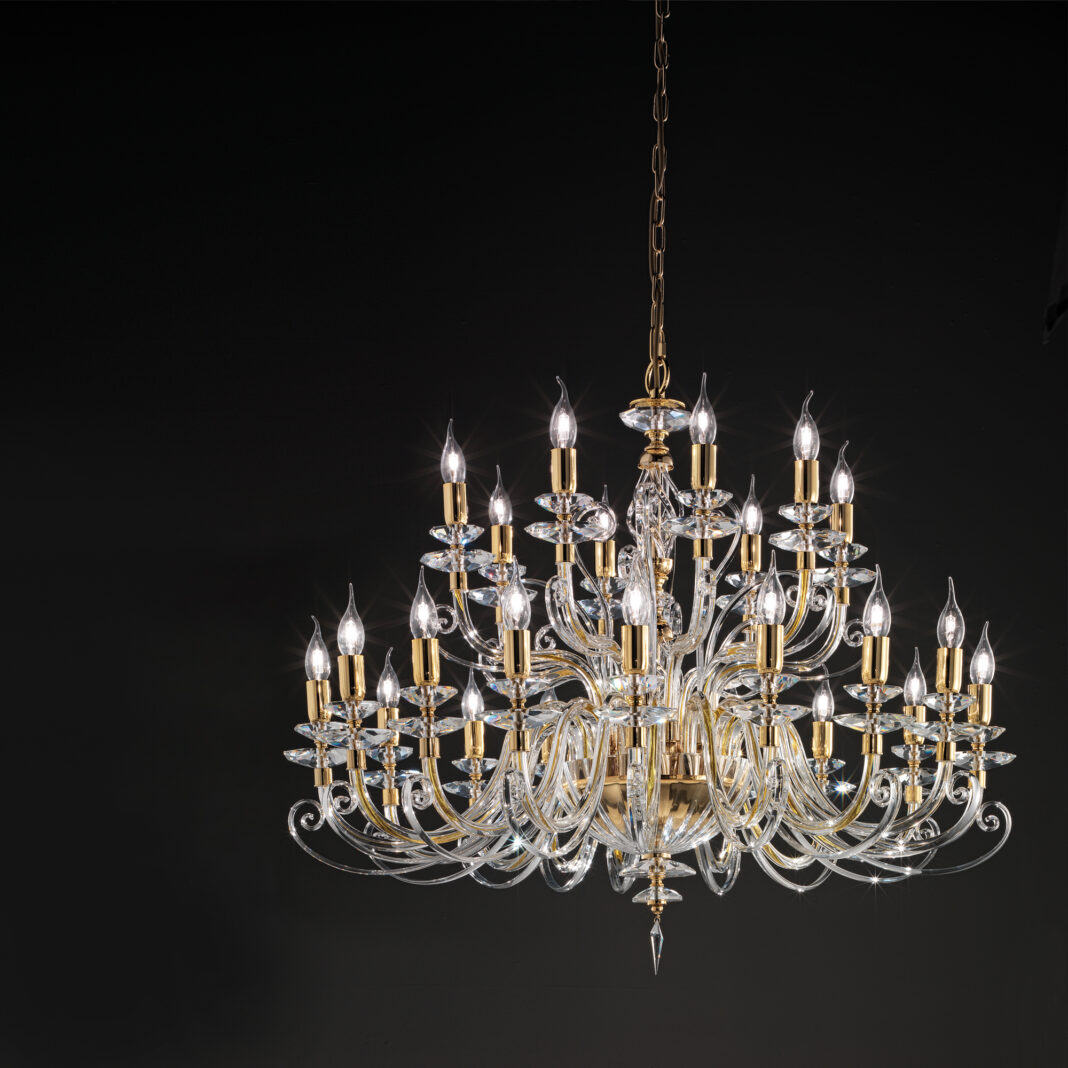 A beautifully detailed ornate brass structure in a polished gold finish, supporting two tiers of statement swirls and 24 clear glass covered arms with dazzling faceted glass bobeches. Embellished with Swarovski® crystal and sphere. Requires 24 x max 40W E14 Bulbs, which are not included. Weight 20.8 kg. Dimensions are plus chain and ceiling cup, and has the minimum drop of 24 cm. Available in various sizes, finishes and with shades by request. Prices will vary.