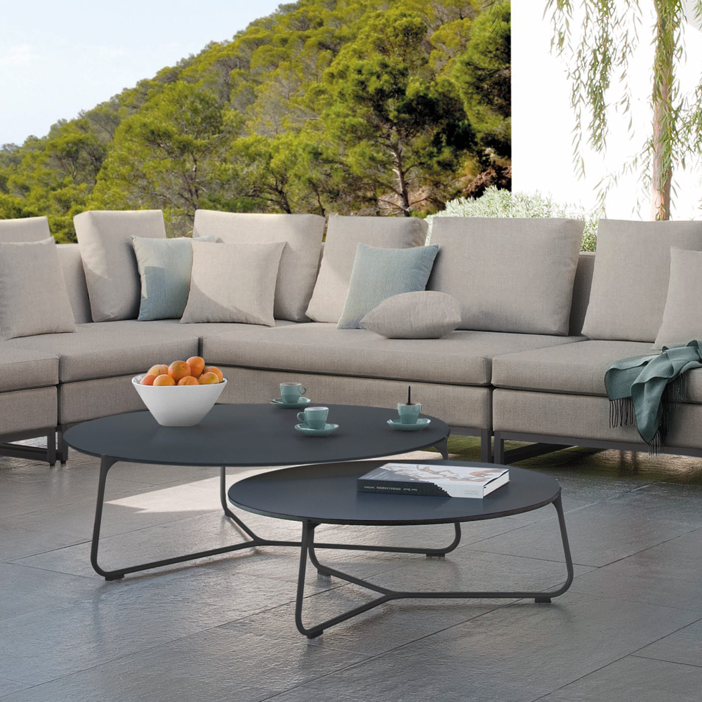 Superbly executed by master craftsmen and outstanding in its use of luxury materials and attention to detail. All in a powder coated anthracite finish with a Soft Fawn fabric upholstery. Created using 5 versatile modules, seat heights 44 cm. Plus the coffee table / footstool which is height 44 cm x width 130 cm x depth 101 cm, so can be used as chaise style extension as shown or coffee table. Upholstery being swimming pool and sea water resistant and repellent. Easy to clean and maintain. Recyclable, GreenGuard certified, REACH certified. The finest of All Weather Fabrics, that have been specifically developed for outdoor use. The fabric is mass-coloured, UV-resistant and does not fade under the influence of light or sunshine. This sofa is also available as part of a fabulous collection, and in various finishes and modular combinations to suit your needs. Protective cover also available by request. Side Table and Coffee Tables also available.