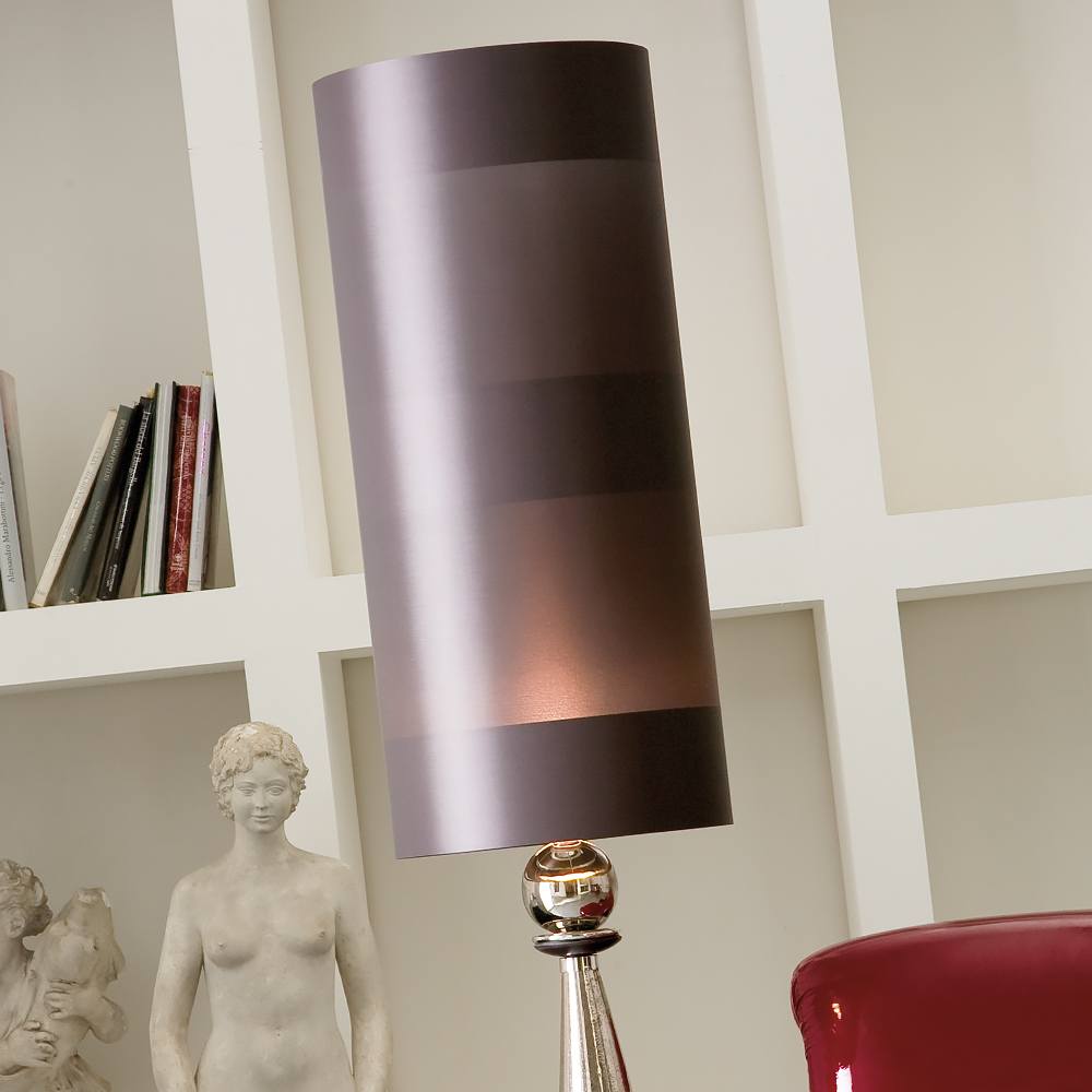 This gorgeous modern floor lamp offers a sensational addition. Featuring a large Majolica base with a platinum plated finish together with chromed brass details. Complete with a large luxurious grey silk shade with silver inner bands. When the light is on the shade is mauve.