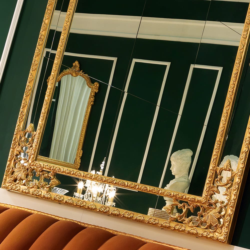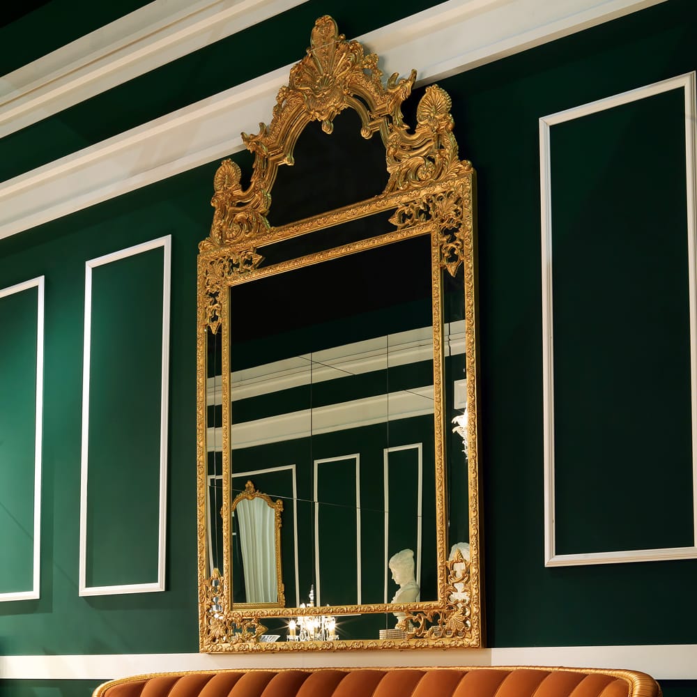 Large GildedĀ Italian Reproduction Mirror. Produced to a world class standard in Italy. Sectional centre panels for an antique style finish. Height 229 cm x width 120 cm. Please allow 12 weeks for production. Available to order in bespoke sizes.