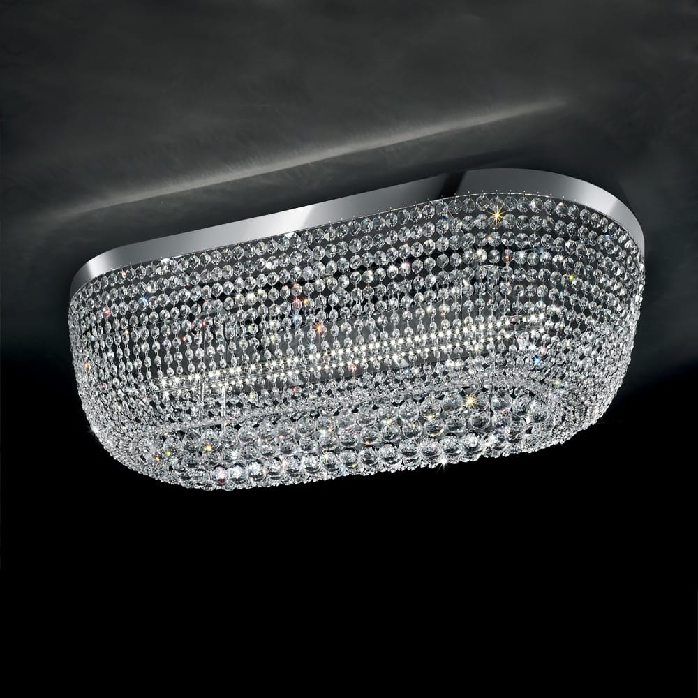 The Large High End Oval Crystal Ceiling Light, this superbly glamorous large ceiling light provides a sophisticated classic focus. The chrome frame boasts strings of cut crystal octagons together with a profusion of large faceted cut crystal spheres offering a seductive ambience.