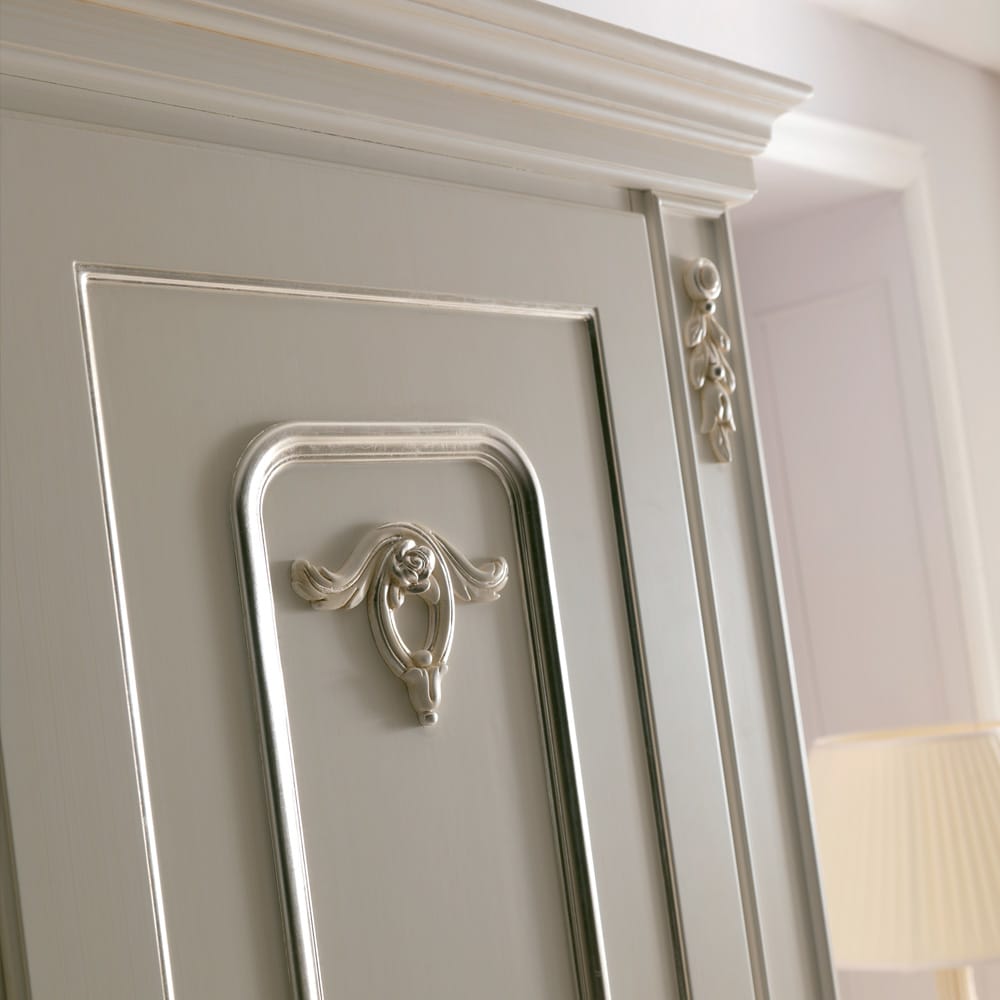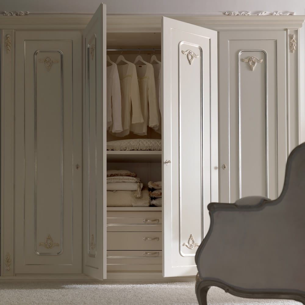 The Large Italian Reproduction Wardrobe is shown here as a 4 door in an antique white and bleached silver finish and comes with 3 wide section internal drawers, 3 shelves and 5 hanging rails as standard. Height 250 cm x width 294 cm x depth 66 cm. Other sizes including 3, 5 and 6 door are also available, in various combinations, with additional internal drawers and shelves and in alternatives in colours and finishes by request. Prices will vary.