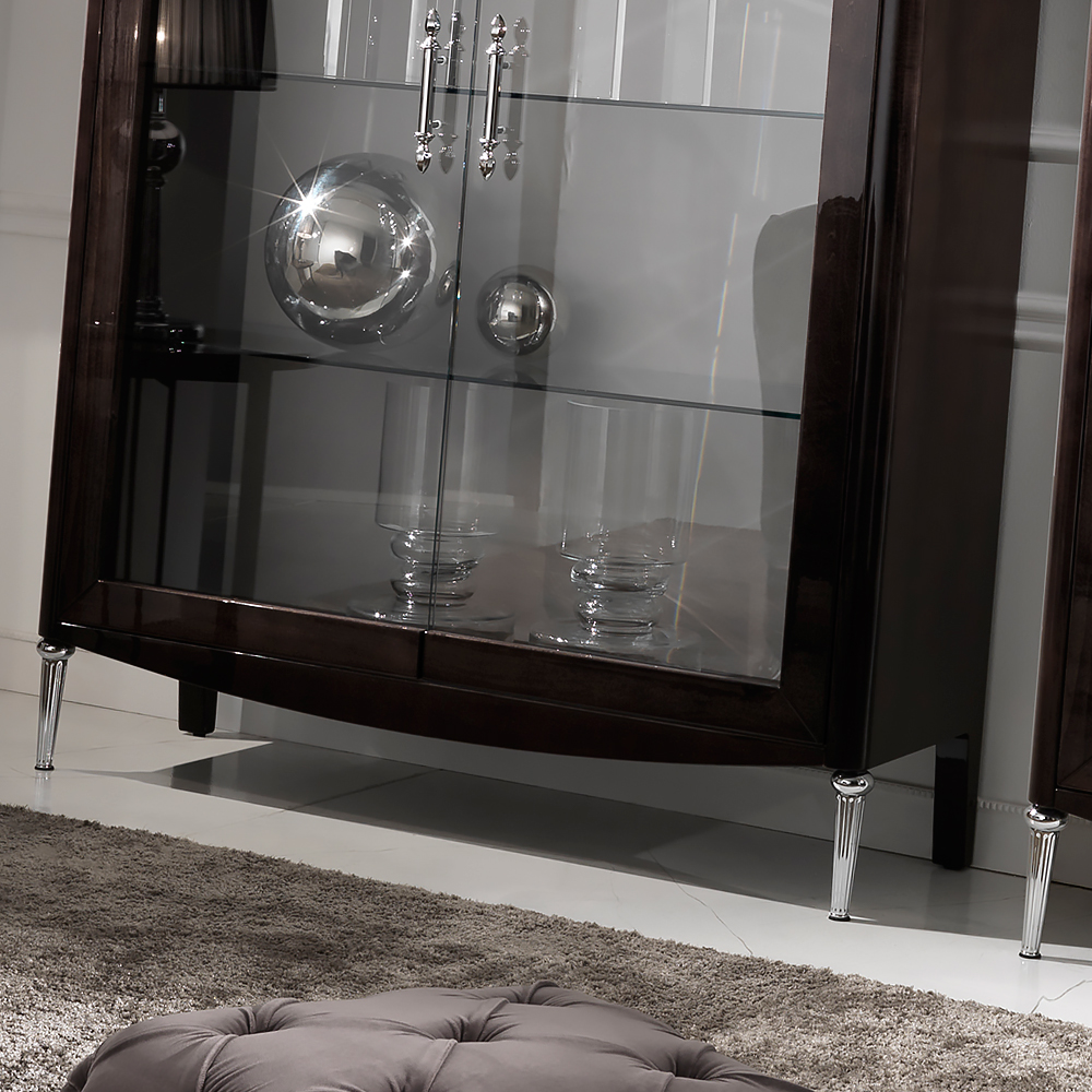 Large Luxury Walnut Veneer Italian Display Cabinet. This hand-crafted display cabinet offers the ultimate in unmistakable classic Italian style. Superbly executed by Italian master craftsmen this display cabinet is particularly outstanding in its attention to detail. The beautifully rounded frame is finished with a fabulous high gloss walnut veneer, together with front feet and handles cast in brass with a polished chrome finish. Includes a polished chrome detail, altogether providing eye-catching accents.