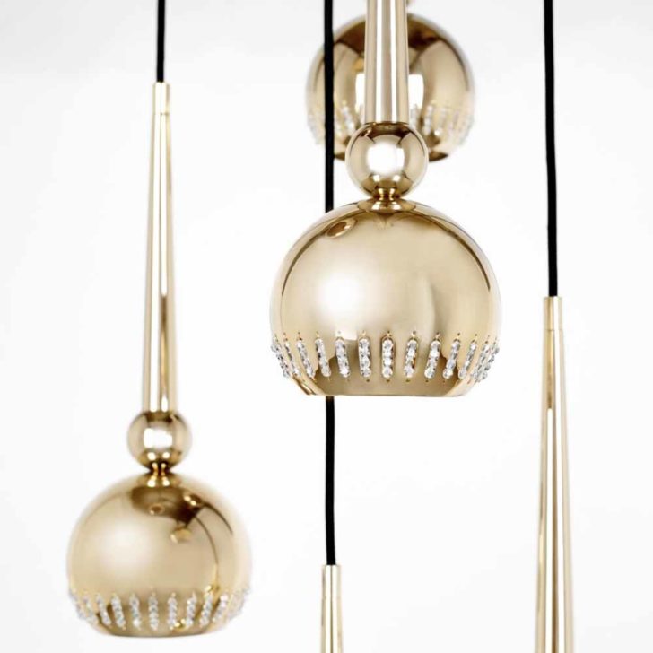 Round brass forms with very clean sophisticated lines are the base of this suspension lamp. Hanging crystals added to the bottom of the pieces create the effect of falling raindrops. Offering the illusion of weightlessness, a display suspended via a modern light gold finished ceiling rose. Requires 19 x G9 max 40W bulbs, which are included. Also available in various other finishes such as matt gold, polished, matt and brushed black and matt black nickel, polished, brushed and oxidised brass, and polished or brushed copper. Offering the ultimate in versatility.